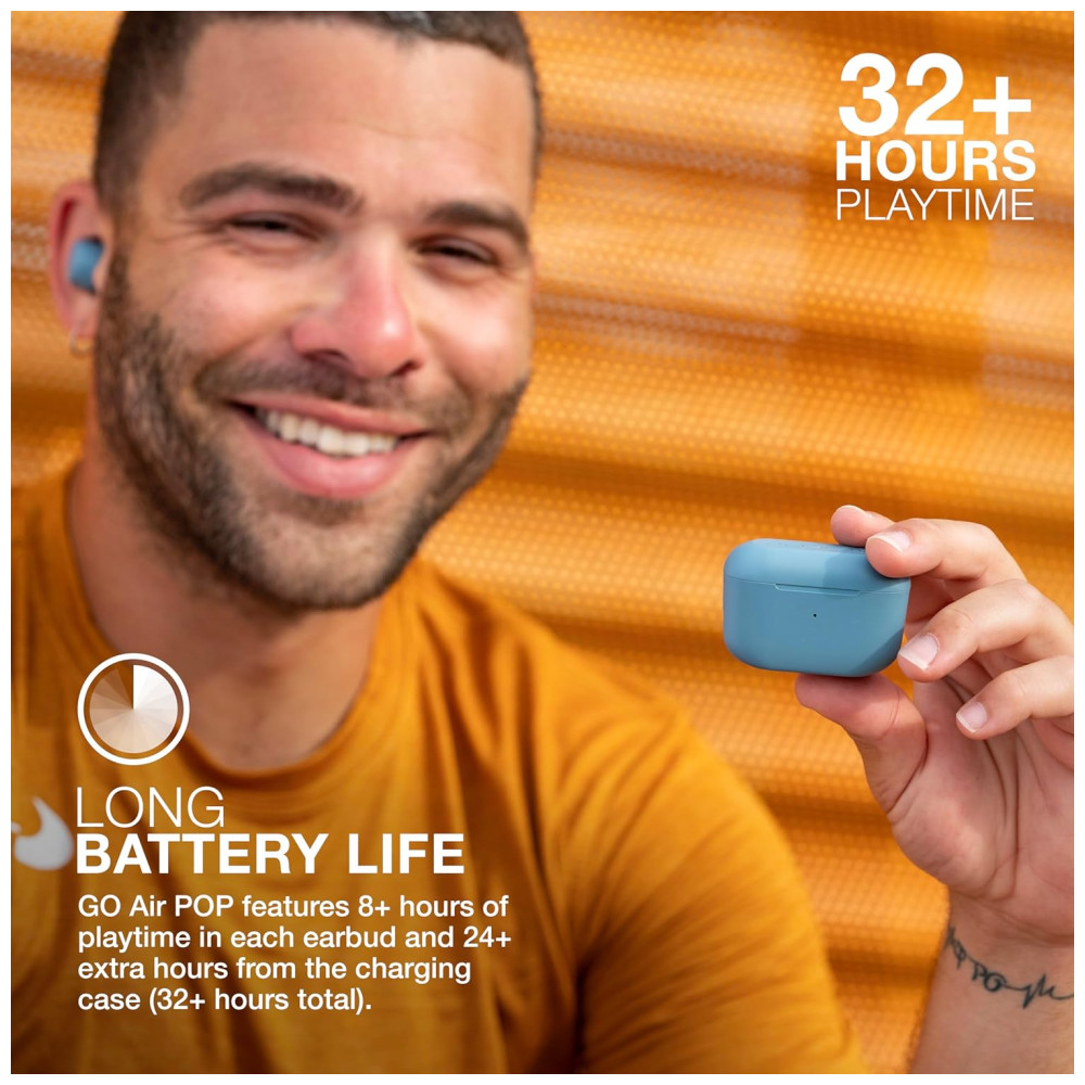Bateria de longa duração o GO Air POP oferece mais de 8 horas de reprodução em cada fone de ouvido e mais de 24 horas extras no estojo de carregamento mais de 32 horas no total. Retorne ao estojo para recarregar os botões e use o cabo USB integrado para carregar o estojo.