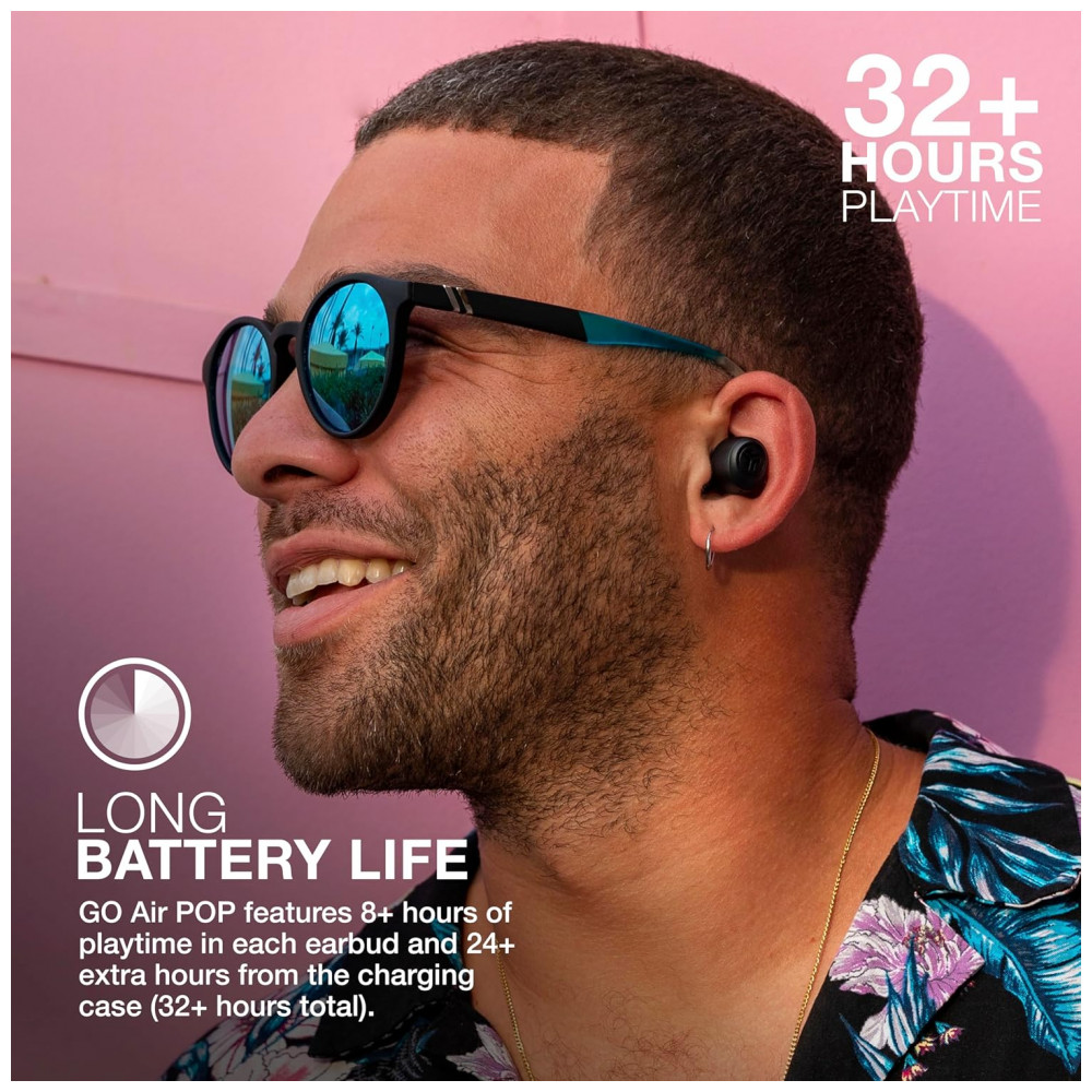 Bateria de longa duração o GO Air POP oferece mais de 8 horas de reprodução em cada fone de ouvido e mais de 24 horas extras no estojo de carregamento mais de 32 horas no total. Retorne ao estojo para recarregar os botões e use o cabo USB integrado para carregar o estojo.