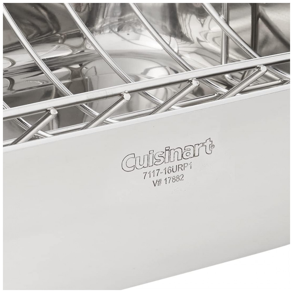 DESIGN EXCEPCIONAL O torrador retangular Cuisinart de é feito com um exterior de aço inoxidável de alto desempenho e alças de aço inoxidável rebitadas. A grelha de aço é grande o suficiente para lidar com um grande peru de Ação de Graças e perfeita para vegetais de raiz de torrefação lenta
