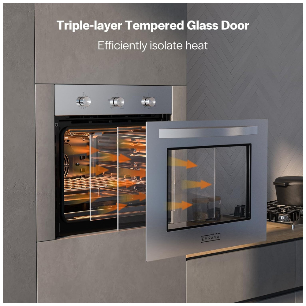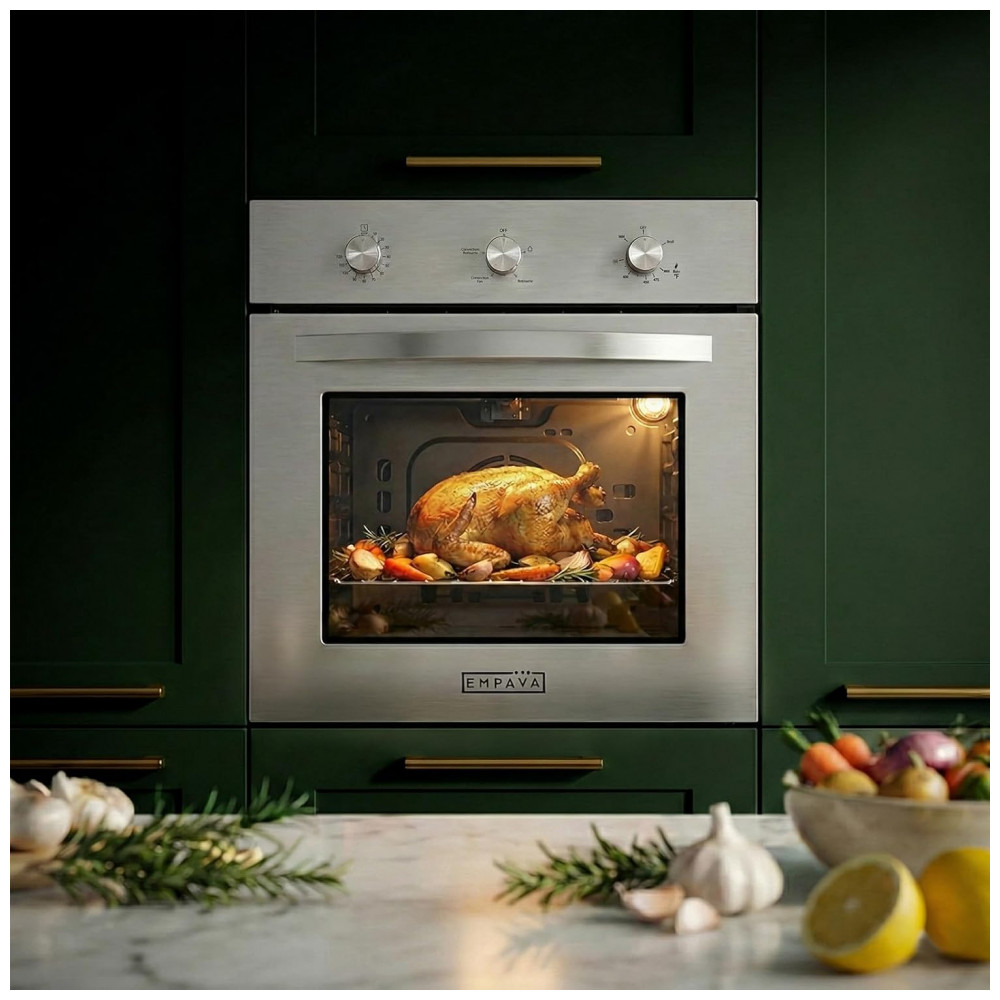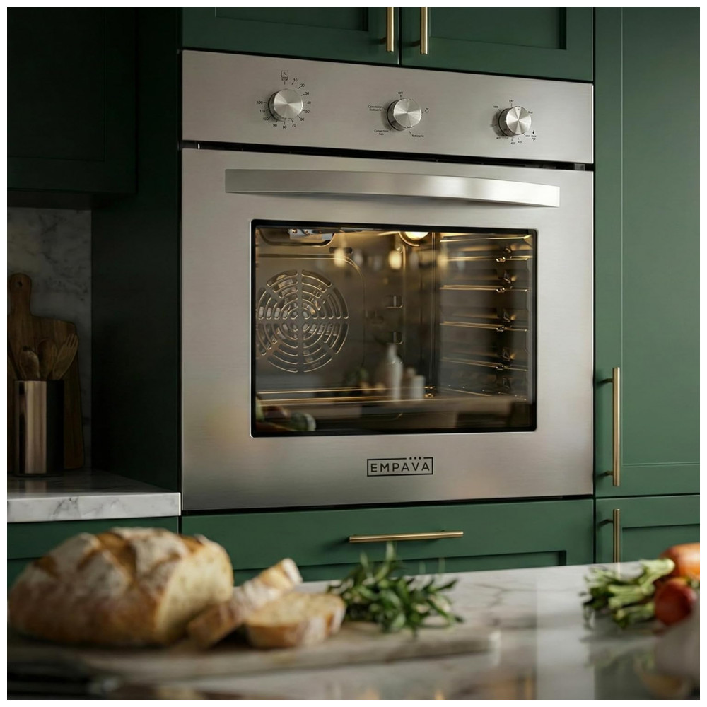 O forno a gás de embutir Empava com largura aproximada de 61cm oferece capacidade interna de cerca de 65 litros, adequado para cozinhas planejadas que buscam um equipamento compacto com boa área útil para assar e grelhar. A tecnologia de convecção distribui o ar quente de forma uniforme dentro da cavidade, reduzindo pontos frios e contribuindo para um cozimento mais homogêneo em diferentes níveis de prateleira.