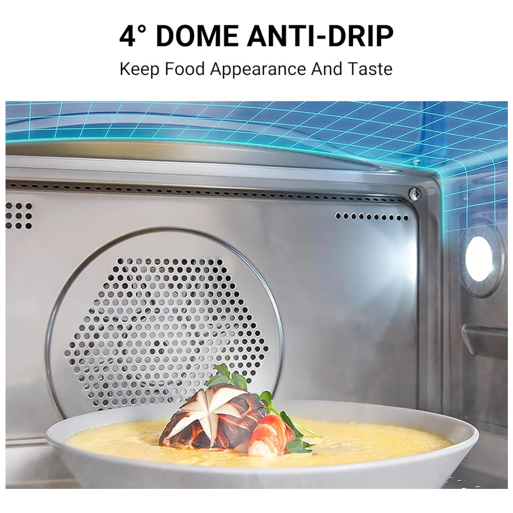 CÚPULA ANTIGOTEJO DE 4°: Acima da cavidade interna do forno a vapor multifuncional, há uma cúpula curva de 4°, permitindo que a condensação do vapor flua de ambos os lados sem pingar nos alimentos. Isso mantém a forma original dos ingredientes sem afetar sua aparência e sabor.