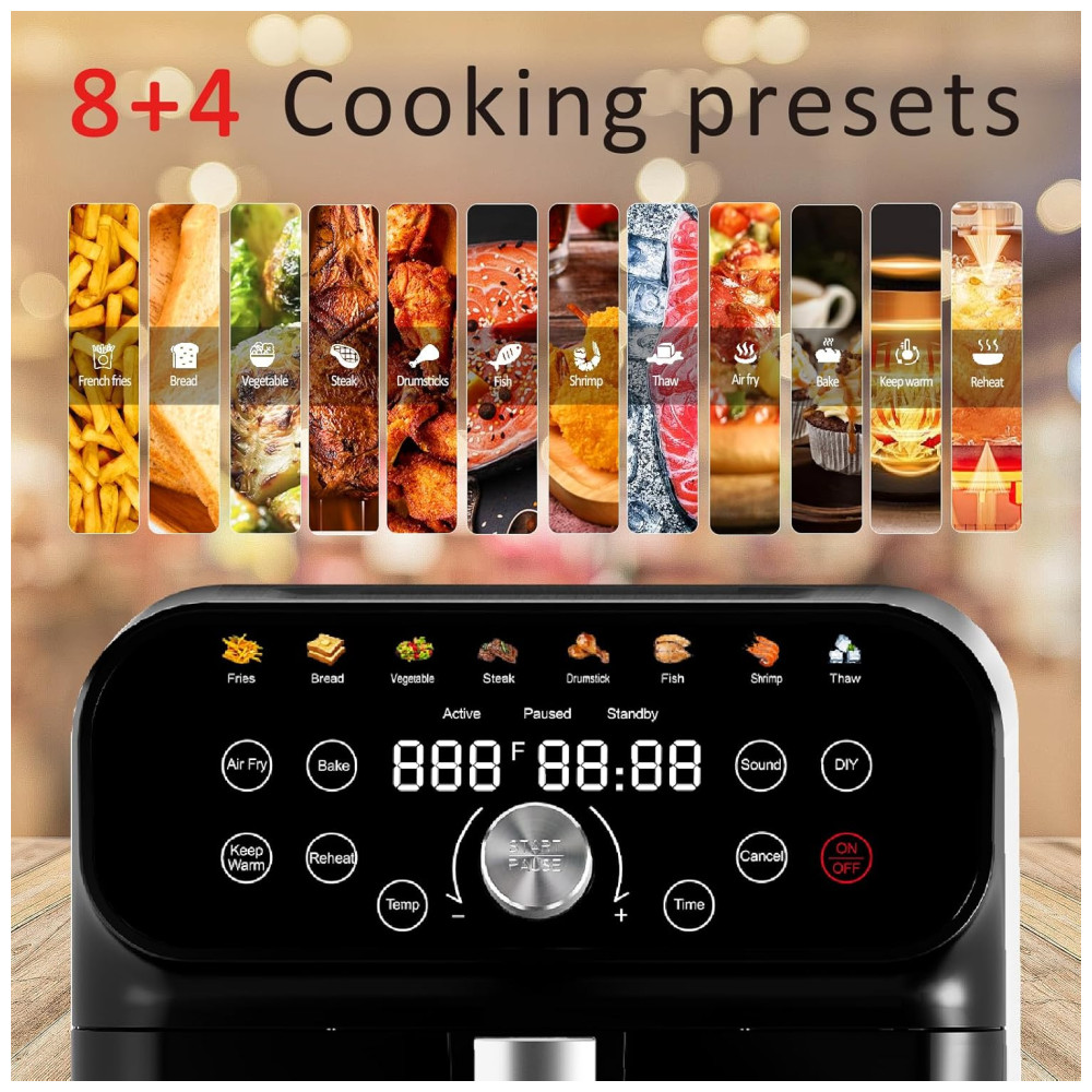 Funções automáticas: 12, incluindo fritar, assar, aquecer, manter quente, descongelar, DIY