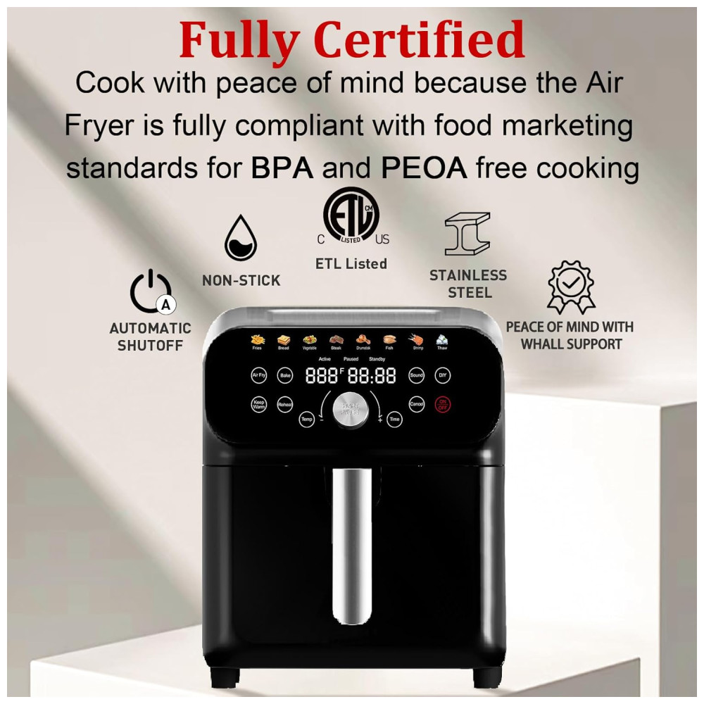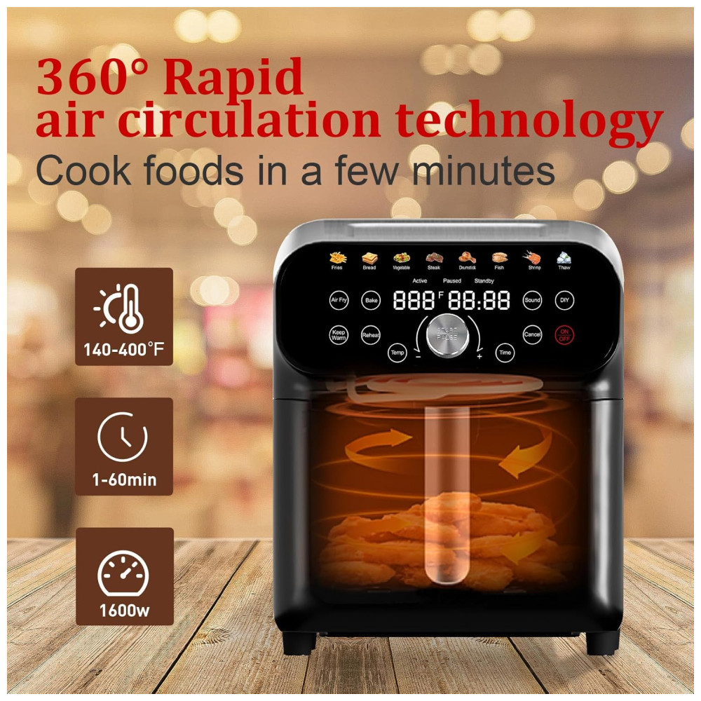 A air fryer Whuto Oven possui capacidade de 6,0 litros e potência de 1600W, combinando corpo em aço inoxidável e acabamento preto fosco para maior durabilidade e design moderno. Oferece 12 funções automáticas de preparo, incluindo fritar, assar, aquecer, descongelar e manter aquecido, controladas facilmente pelo painel touchscreen LED. O cesto quadrado antiaderente amplia a área útil na preparação e pode ser lavado em lava-louças para limpeza prática.