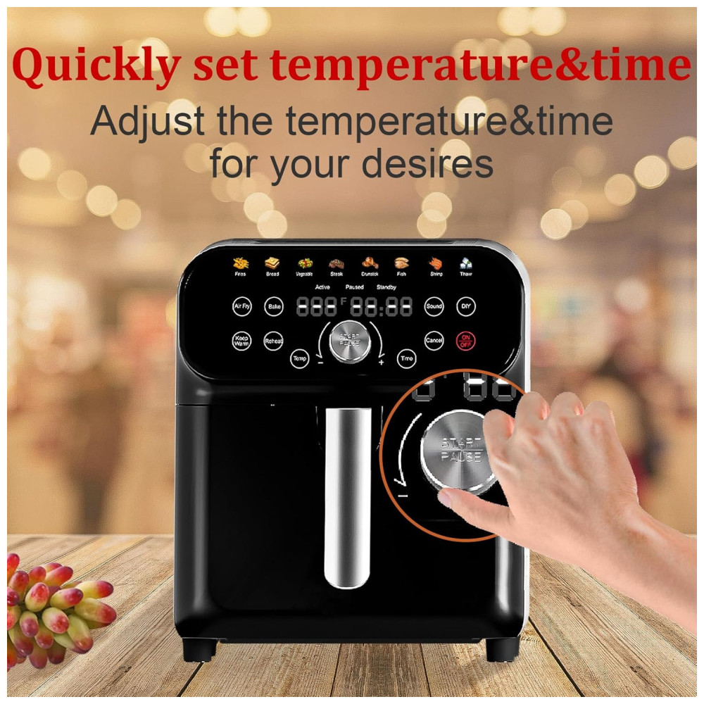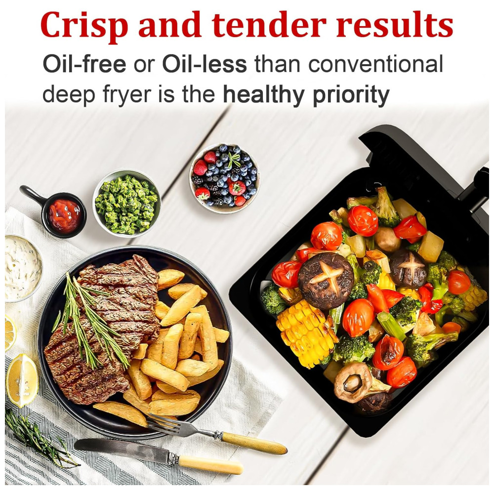 A tecnologia de circulação de ar rápida reduz o tempo de pré-aquecimento e consome até 85% menos óleo em comparação com fritadeiras tradicionais, proporcionando refeições mais saudáveis. Controle digital de temperatura entre 80°C e 200°C e timer programável de 1 a 60 minutos. Possui funções de memória, desligamento automático, proteção contra superaquecimento e sobrecarga elétrica.