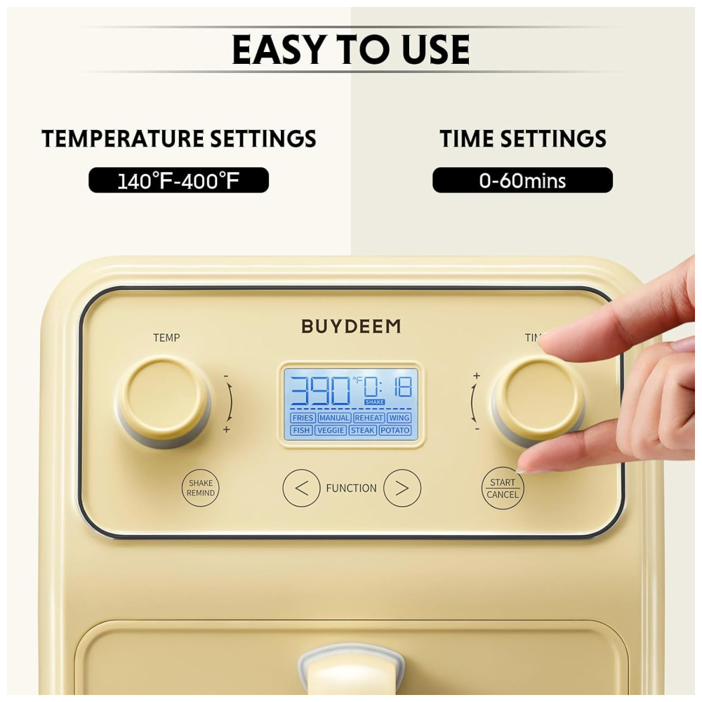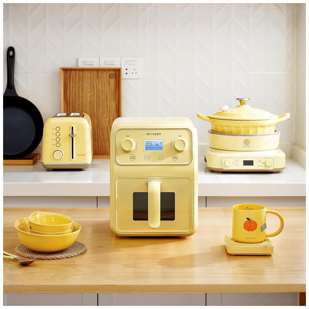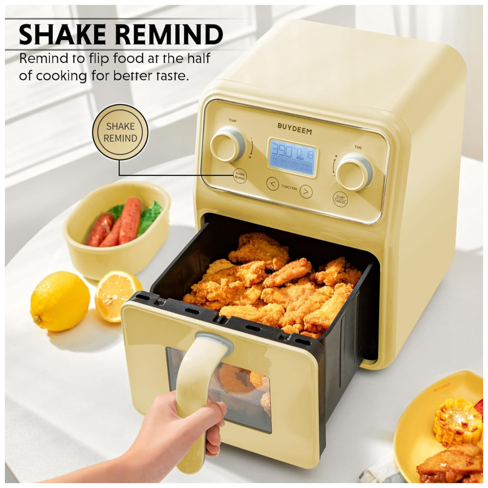 Forno Airfryer 4 Litros 8 em 1 com Janela Retrô e Lembrete de Agitar 110V 1200W Buydeem Amarela