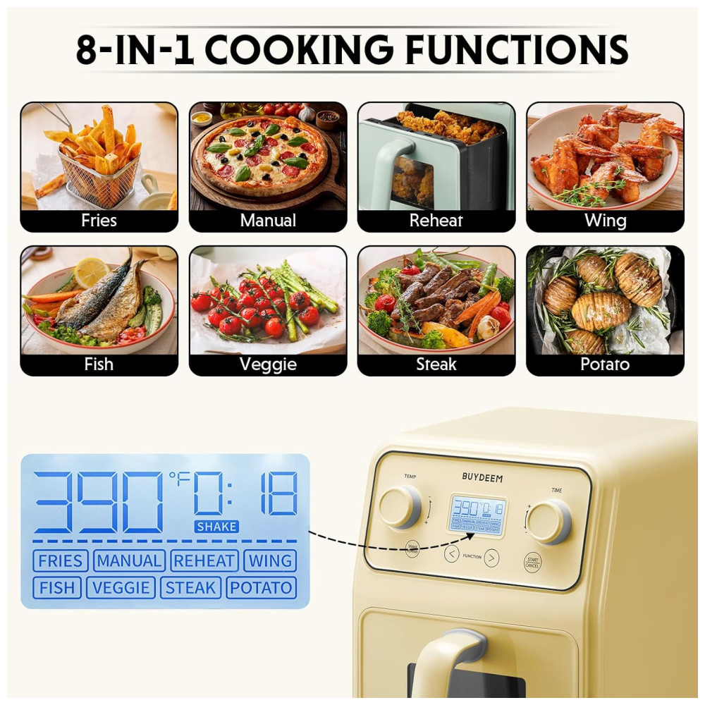 Com esta fritadeira de ar, você pode cozinhar uma variedade de alimentos, desde batatas fritas até asas, peixes, vegetais, bifes e batatas. Além disso, funções manuais e de reaquecimento também estão incluídas para atender a todas as suas necessidades de refeição. Você pode personalizar facilmente as configurações de temperatura e tempo para obter resultados perfeitos sempre.