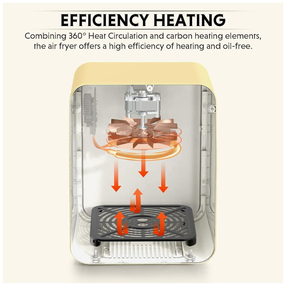 Com circulação de calor de 360 graus e elementos avançados de aquecimento de carbono, esta fritadeira de ar permite que você desfrute de refeições com até 90 menos óleo, ideal para manter uma dieta saudável sem sacrificar o sabor crocante. A janela visível de camada dupla permite que você monitore o progresso do cozimento sem perder calor.