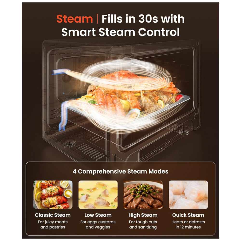 A cavidade interna é construída em aço inoxidável 304 de grau alimentar, com painel traseiro revestido em cerâmica para reduzir aderência de gordura e facilitar a limpeza. O tubo de aquecimento inferior é dobrável, permitindo acesso para remoção de migalhas e resíduos. O tanque de água externo removível possibilita reabastecimento sem interromper o ciclo de cocção, e o duto de saída de vapor direcionado ajuda a proteger armários próximos contra umidade excessiva. A porta frontal em vidro temperado triplo melhora o isolamento térmico, mantém a frente mais fria ao toque e oferece boa visibilidade interna.