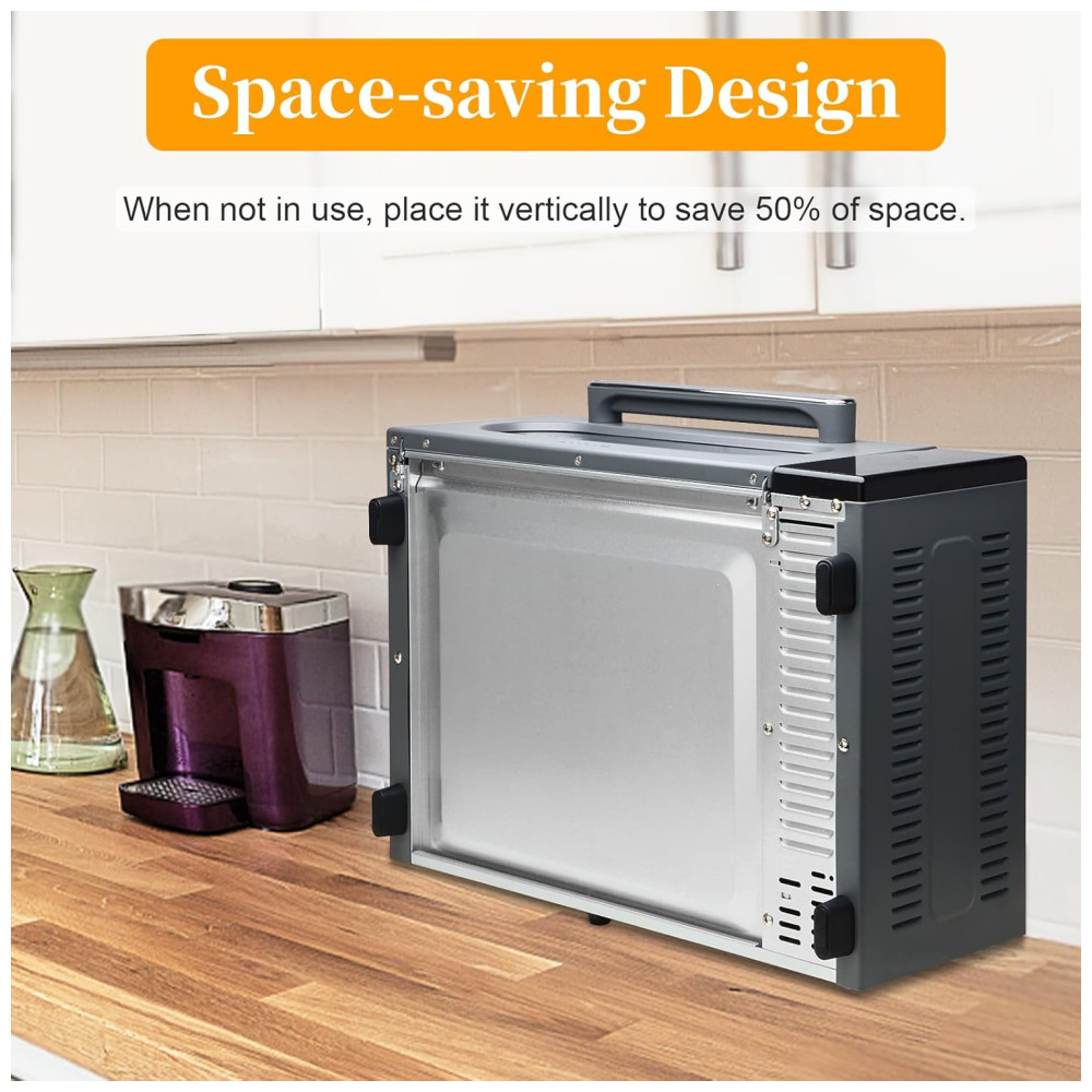 O interior espaçoso permite tostar até 9 fatias de pão ou assar uma pizza de 30 cm, enquanto as 2 posições de prateleiras oferecem flexibilidade para diversos tipos de alimentos. Apesar de sua capacidade generosa, o design compacto economiza espaço na bancada e, ao ser armazenado verticalmente, reduz o uso de espaço em até 50%.