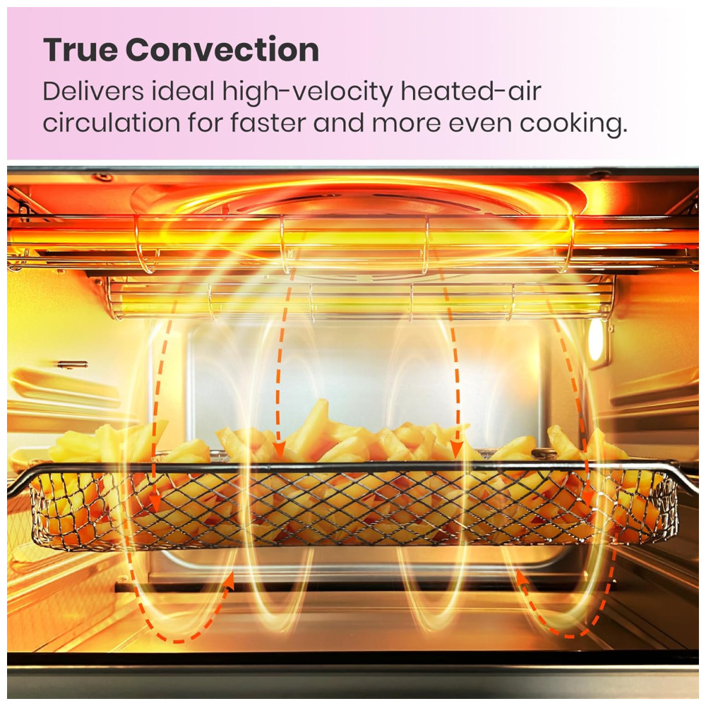 Capacidade Ampla para Família e Festas: Com um espaço 30% a 60% maior do que fornos convencionais, este modelo permite assar um frango de 2,2 a 2,7 kg, tostar até 6 fatias de pão, preparar uma grande porção de batatas fritas, 20 asas de frango ou uma pizza de 30 cm, tornando-o ideal para refeições em família e eventos.