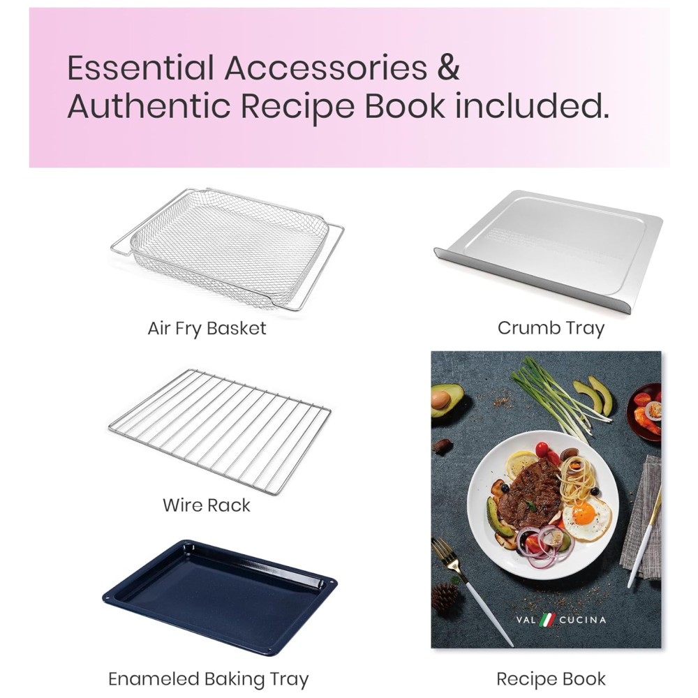 Acessórios Inclusos: Bandeja de Assar com Esmalte Antiaderente (livre de PTFE/PFOA), Grelha, Cesto de Air Fryer, Bandeja de Migalhas e um Livro de Receitas Premium com instruções de chef.