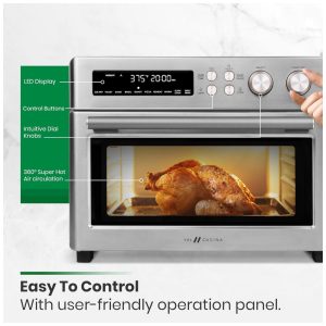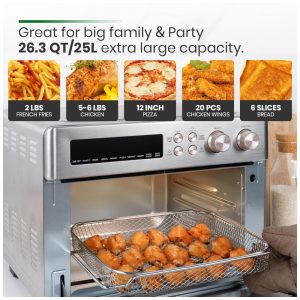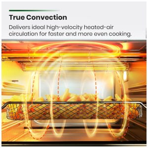 Capacidade Familiar e para Festas: Com 30% a 60% mais capacidade do que outros modelos, este forno comporta um frango de 2,2 a 2,7 kg, 6 fatias de pão, uma grande porção de batatas fritas, 20 asas de frango ou uma pizza de 30 cm de diâmetro. Ideal para refeições em família e eventos sociais.