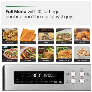 Versatilidade 10 em 1: Com 10 funções digitais predefinidas, este forno air fryer permite Air Fry, Tostar, Assar, Grelhar, Assar Lento, Reaquecer, Manter Aquecido, Cozimento Lento e Desidratar. É o aparelho perfeito para uma ampla variedade de receitas, proporcionando uma experiência culinária prática e completa.