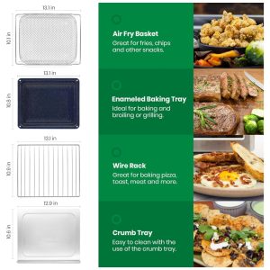 Acessórios Inclusos: Bandeja de Assar com Esmalte Antiaderente (livre de PTFE/PFOA), Grelha, Cesto de Air Fryer, Bandeja de Migalhas e Guia de Receitas Premium.