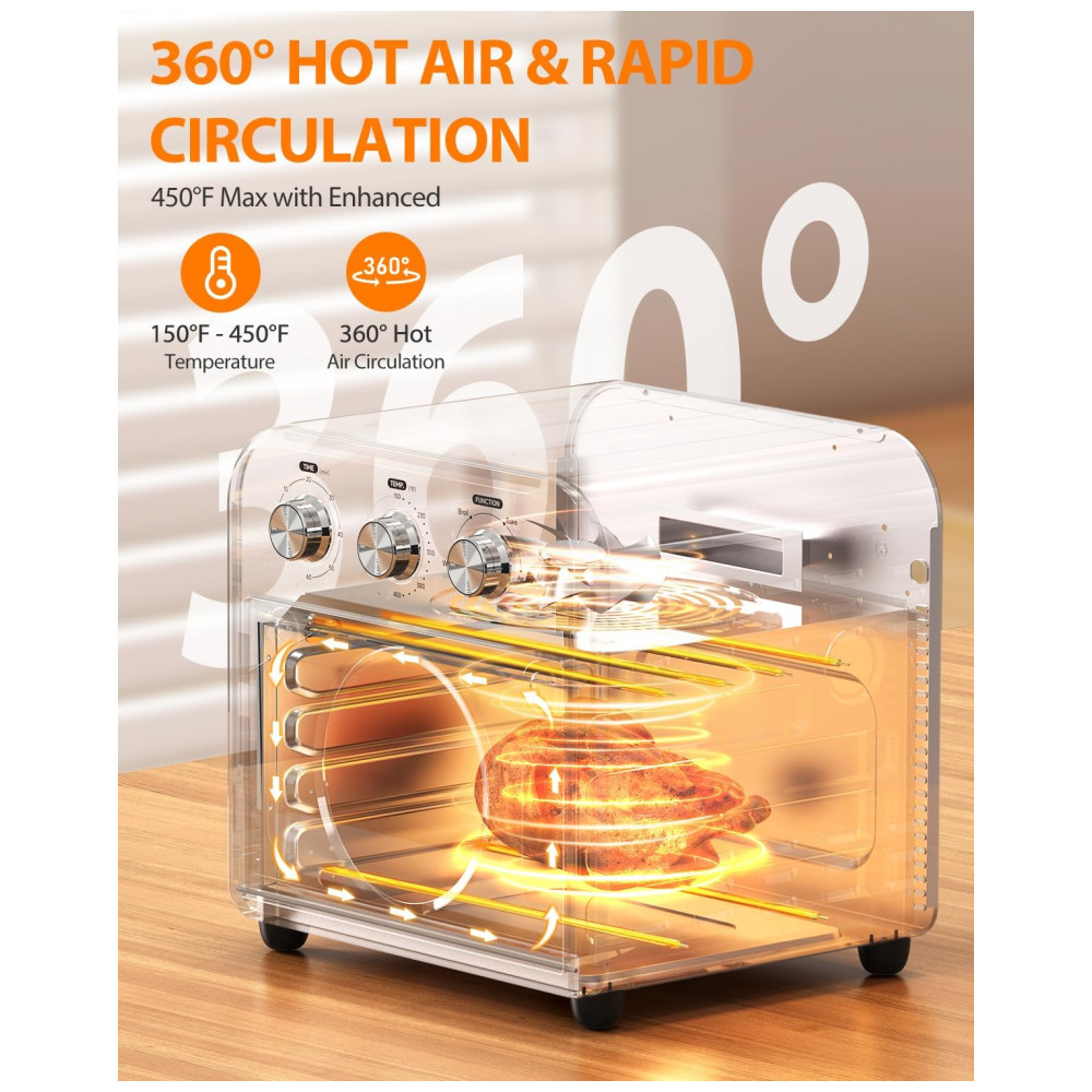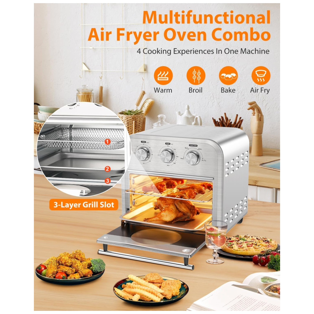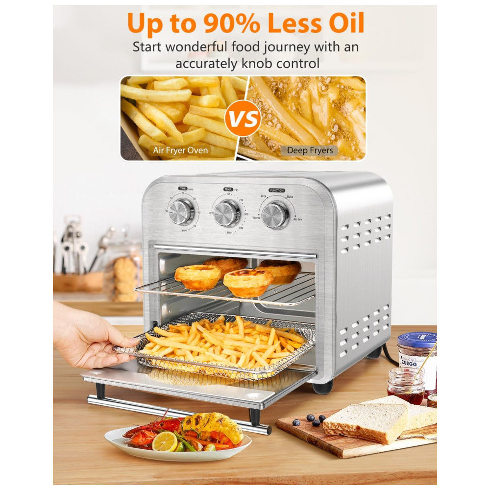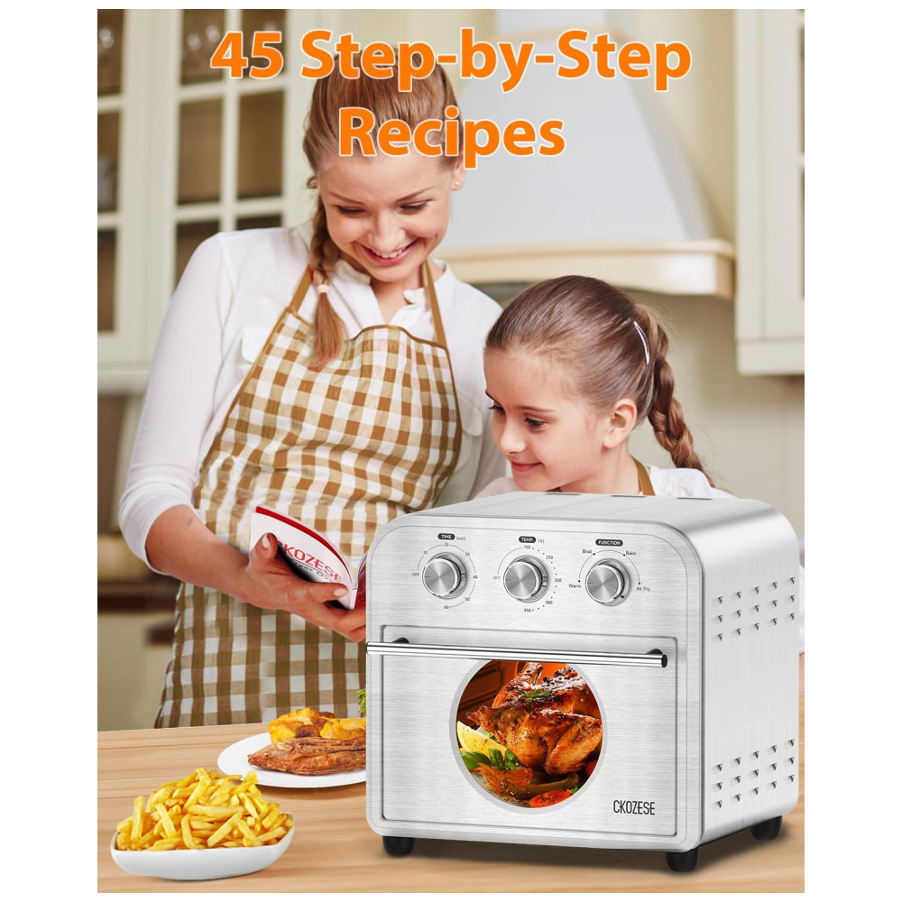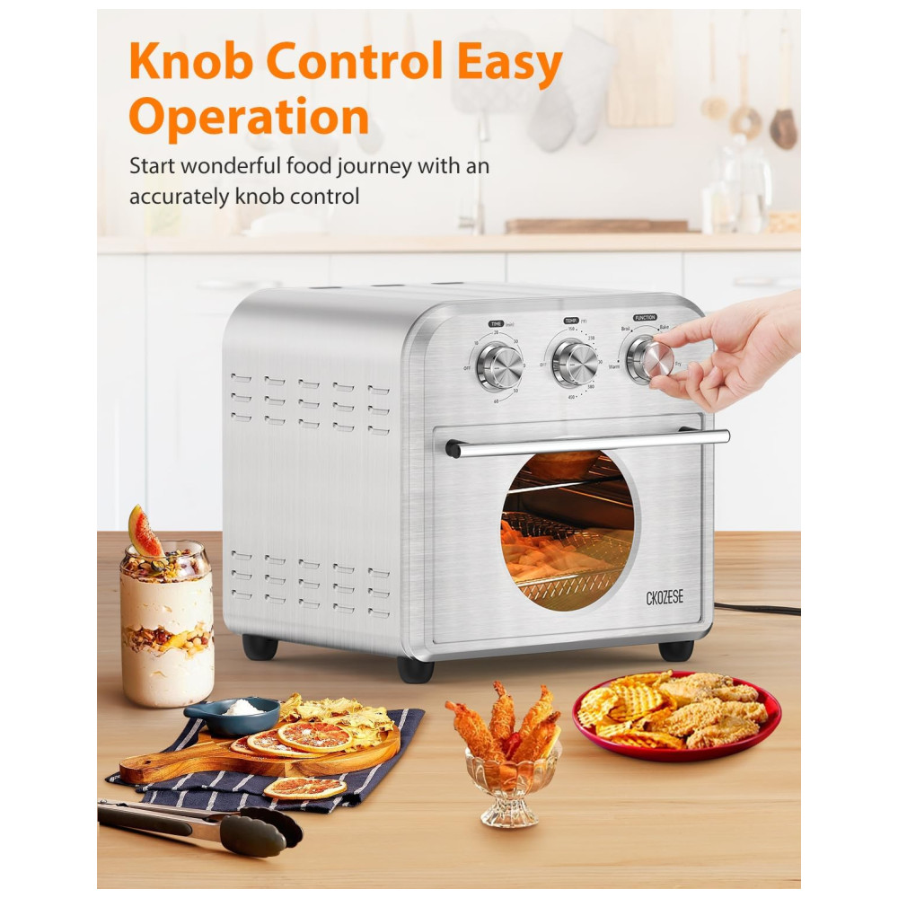 Aço Inoxidável de Grau Alimentício: Fabricado com aço inoxidável de alta qualidade, o forno air fryer CKOZESE é seguro, durável e fácil de limpar. Inclui quatro acessórios essenciais: uma bandeja de assar, grelha, cesto de air fryer e bandeja de migalhas.