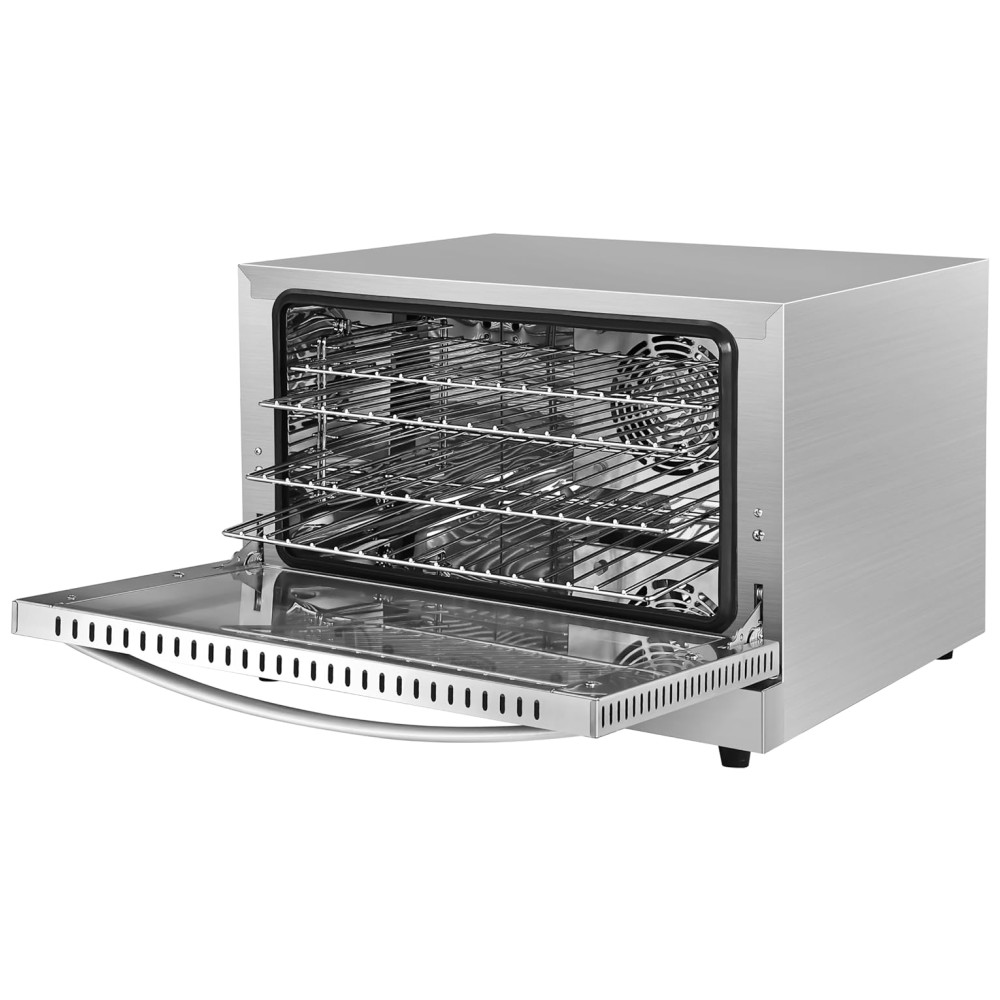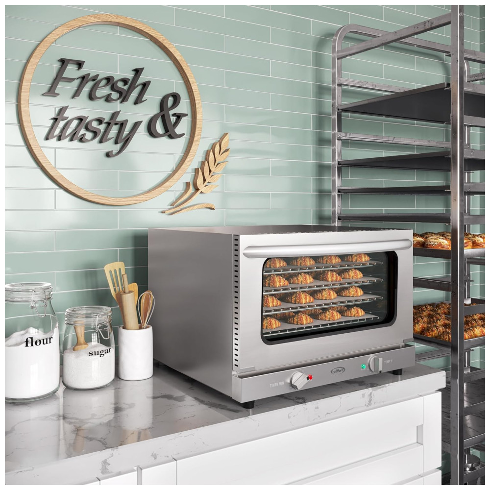 O Forno de Convecção Comercial da KoolMore oferece versatilidade para espaços de cozinha profissionais. Com suporte para assar em baixa quantidade e médio reaquecimento, ele é ideal para pequenos restaurantes, cafeterias, padarias e muito mais. Possui quatro prateleiras para assadeiras de metade de tamanho, permitindo assar e preparar vários alimentos simultaneamente. Seu design acessível de bancada facilita o acesso aos alimentos. Construído em aço inoxidável premium, oferece durabilidade e resistência. Com potência de 1600W, temperatura máxima de aquecimento de 260°C, produz calor uniforme para uma cocção ótima.