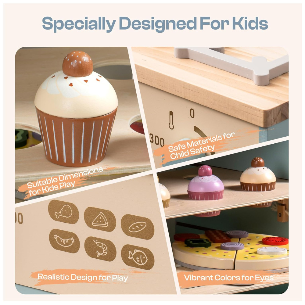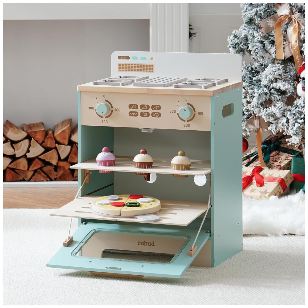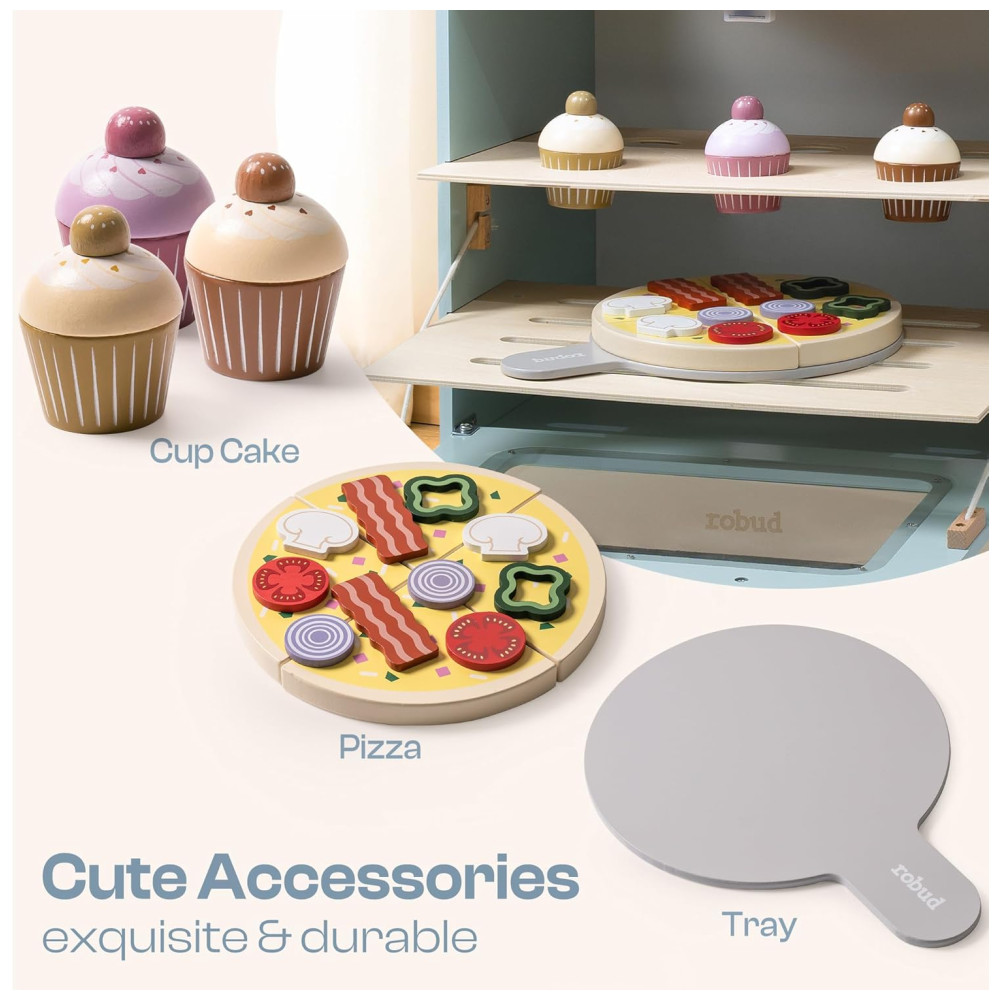 Forno de Cozinha Educativa de Brincar em Madeira ROBUD com Mini Cupcakes e Pizza para Crianças – Brinquedo Realista de Forno de Madeira