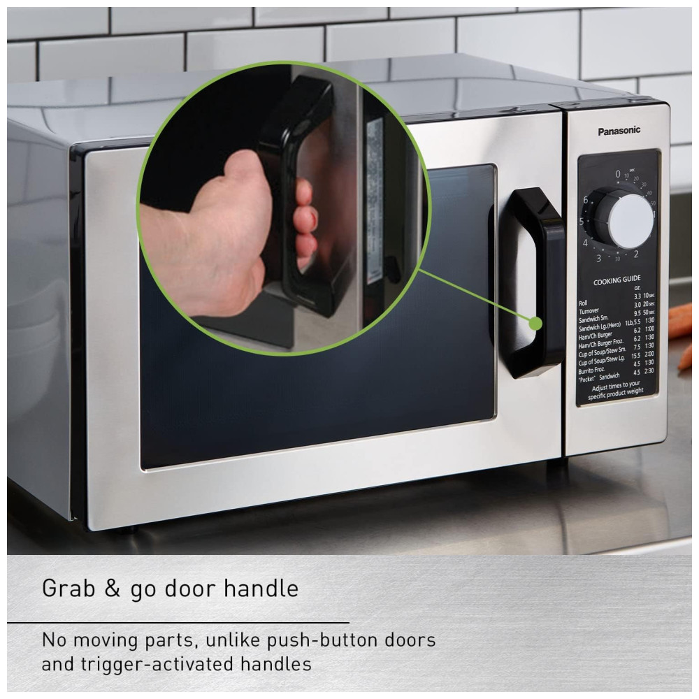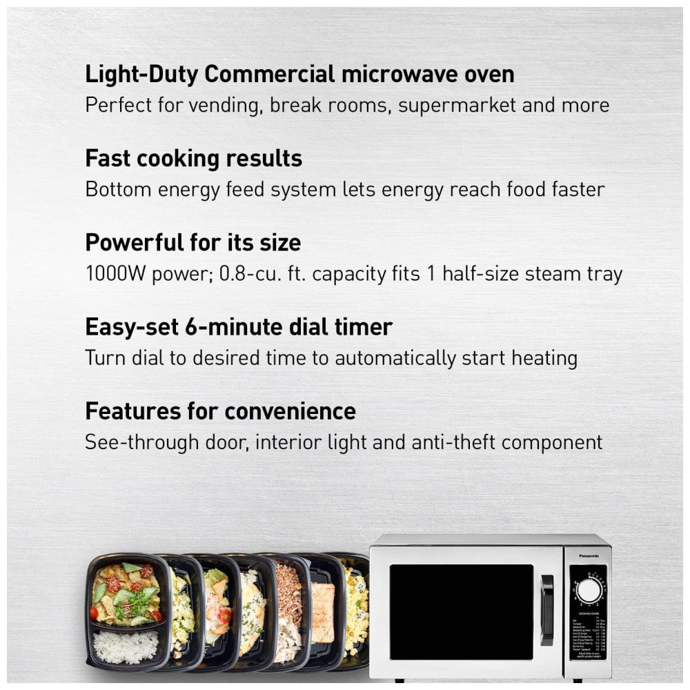 O forno de micro-ondas comercial Panasonic NE1025F nível light-duty é perfeito para espaços pequenos. Com 1000W de potência e capacidade interna, ele acomoda uma bandeja de vapor meio tamanho, 6 polegadas de profundidade. Seu design sem prato giratório e sistema de alimentação de energia inferior trazem os alimentos mais perto da fonte de energia para um aquecimento mais rápido. A porta deste micro-ondas comercial dispensa peças móveis, apresentando uma alça ‘grab and go’ eficiente em aço inoxidável, garantindo desempenho suave e durabilidade. Com timer eletrônico preciso de 6 minutos, porta transparente, luz interna, este micro-ondas compacto é ideal para uso comercial.