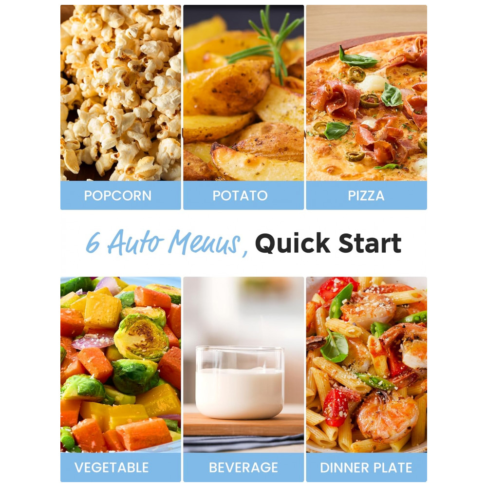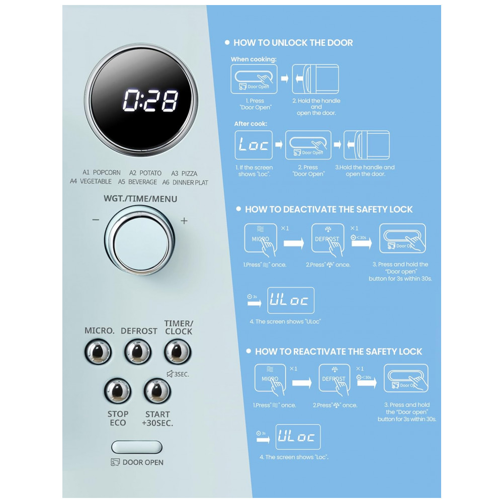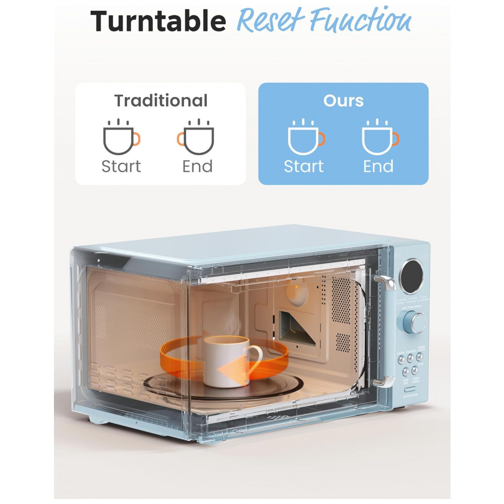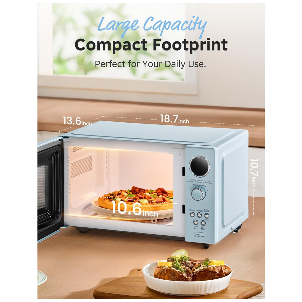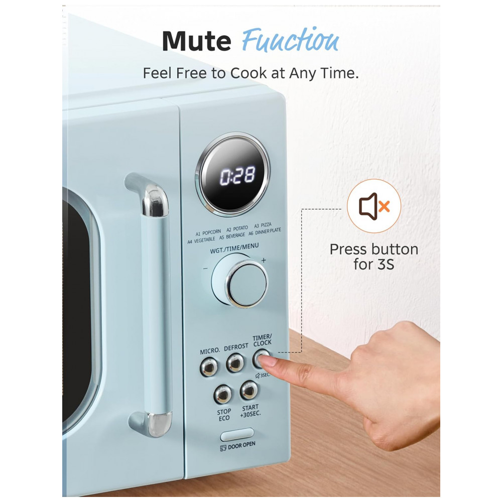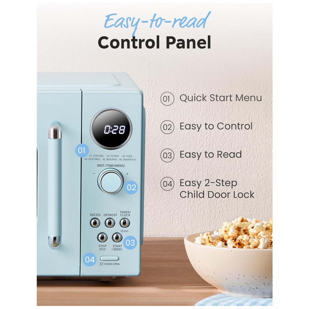 O Forno de Micro-ondas Retro COMFEE de 25,48 litros e 900 watts combina o charme vintage com funcionalidades modernas. Com 6 menus automáticos, função de descongelamento fácil, cozimento por micro-ondas com 10 níveis de potência e botão de cozimento rápido, você pode preparar refeições completas com facilidade. Compacto, porém espaçoso o suficiente para a maioria dos pratos comuns, como uma pizza de 25,4 cm. Com opções de cozimento rápido, função de descongelamento por tempo ou peso, modo eco economizador de energia, função mudo, relógio e timer de cozinha. O design retro estiloso, display digital LED, painel de controle de fácil leitura e botões arredondados de toque suave melhoram a experiência do usuário. Ideal para cozinhas de apartamentos, casas de férias, escritórios e dormitórios. Possui ainda o bloqueio de segurança infantil de dois estágios para maior proteção. Cozinhar nunca foi tão fácil e estiloso!