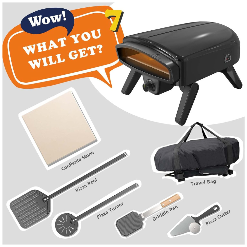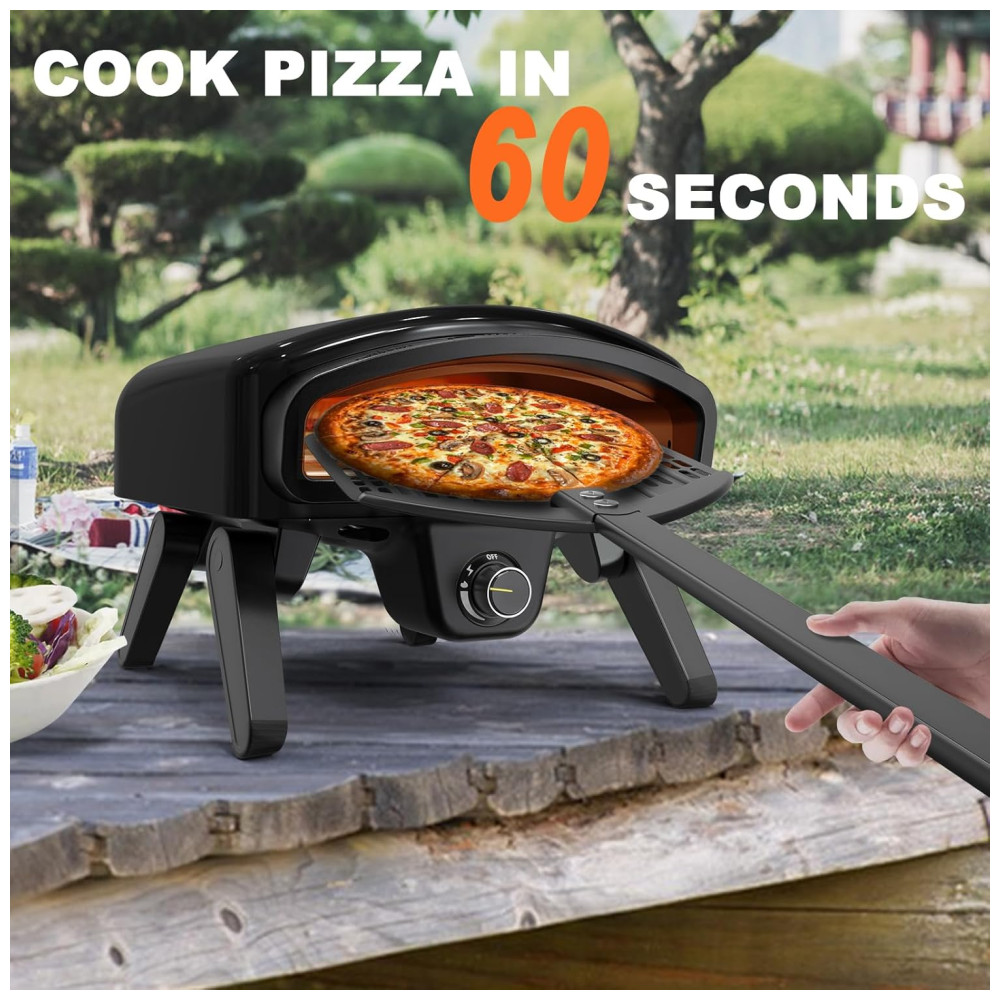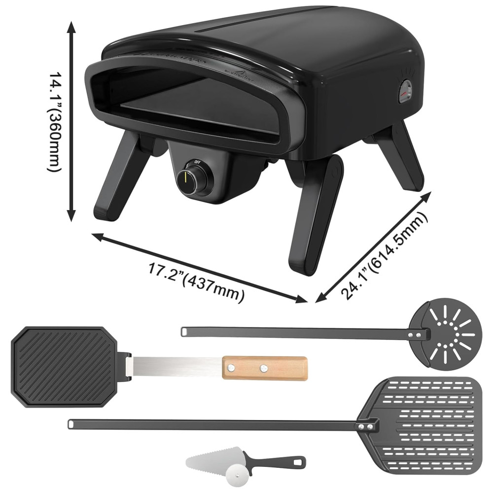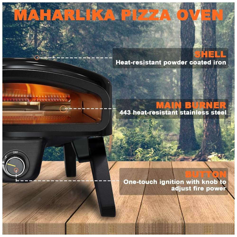O Forno de Pizza Maharlika é um equipamento profissional para uso externo, com dimensões de 17,2 x 24,1 x 35,81 cm. Ele vem completo com acessórios necessários para pizza, incluindo pedra para pizza, casca de pizza, grelha, virador de pizza, cortador de pizza, bolsa de transporte, manual de instruções e instruções de segurança. O design de isolamento do corpo dos fornos de pizza a gás evita queimaduras na pele, enquanto a proteção contra superaquecimento garante um cozimento seguro. A camada interna é feita de aço inoxidável 443 resistente ao calor e a camada intermediária é preenchida com fibra cerâmica para retenção superior de calor. O forno de pizza apresenta ignição instantânea a gás, o que significa chama instantânea, e o botão de controle facilita o ajuste e o controle da chama durante o cozimento. Ele tem uma temperatura máxima de mais de 540 ºC, permitindo que você desfrute de pizza napolitana crocante em apenas 60 segundos. O forno de pizza portátil apresenta um design compacto e vem equipado com 4 pernas dobráveis para economizar espaço e oferecer mais estabilidade do que um forno de pizza de 3 pernas. Por favor, não mova o forno durante o cozimento.