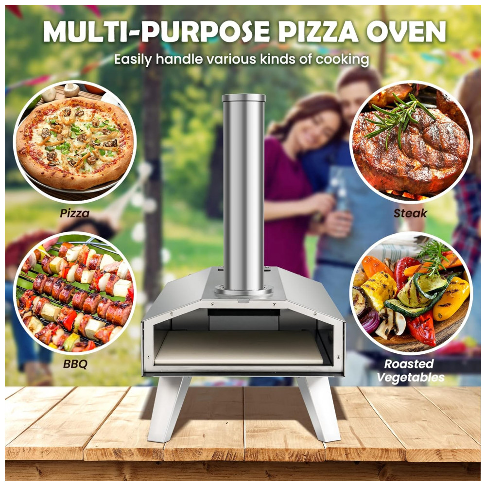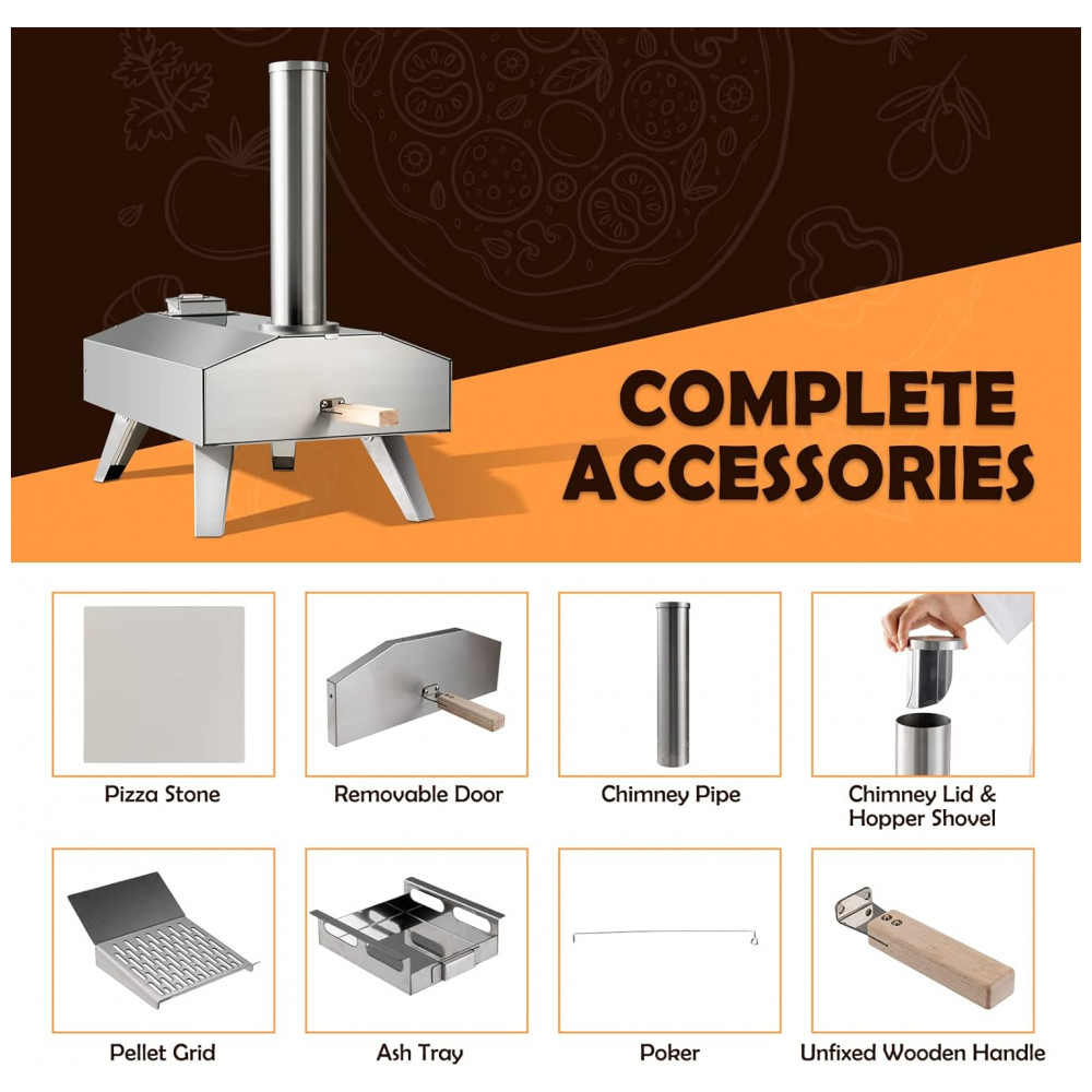 Acessórios completos Um forno de pizza parcialmente pré montado, todas as peças e instruções detalhadas estão incluídas na embalagem para uma montagem rápida e fácil. Você receberá 1 x forno de pizza, 1 x pedra de pizza, 1 x pôquer, 2 x cabos de madeira de borracha, 1 x chaminé destacável, 1 x cinzeiro, 1 x grelha de pellets