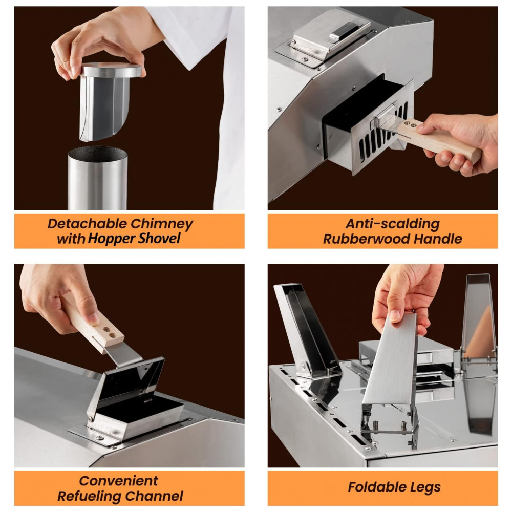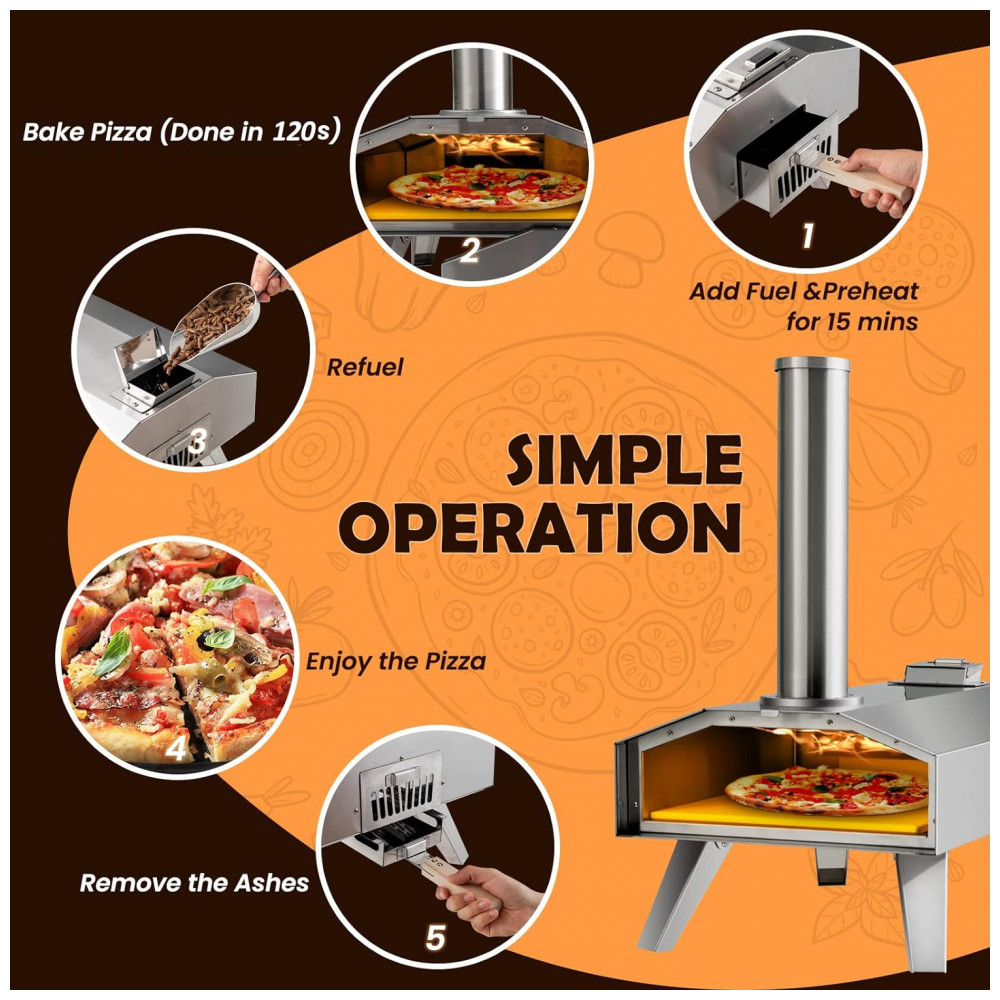 Operação ultra simples Uma deliciosa pizza ficará pronta em poucos passos. Você precisa adicionar combustível à grade de pellets, fechar a porta do forno e pré aquecer por cerca de 15 minutos. Então você pode assar a pizza e adicionar pellets pelo canal, se necessário. O forno de pizza é capaz de aquecer até 460C.