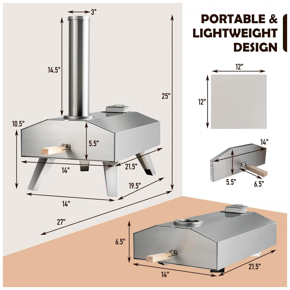 Design portátil e leve Depois de dobrar as pernas e retirar a chaminé, o forno de pizza externo mede apenas 54, x 35, x 16,5 centimetros C x L x A, o que é conveniente para zenamento e transporte. Além disso, o peso leve de 10,4 kg permite que você o carregue sem esforço para onde quiser, como quintal, camping, piquenique e outras atividades ao ar livre.