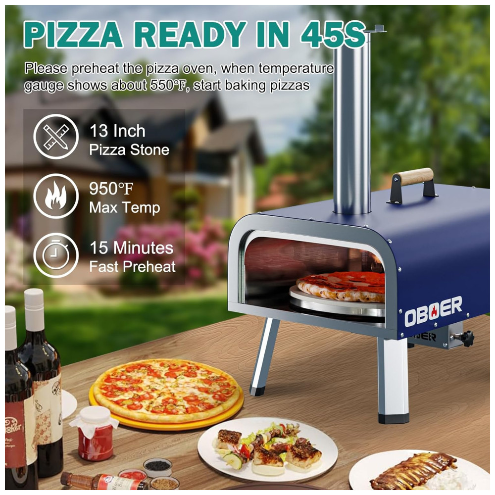 GRANDE PIZZA EM 45 SEGUNDOS Nosso forno de pizza ao ar livre pode atingir 288C em 25 a 30 minutos após queimar com combustível, cozinhando deliciosas pizzas em cerca de 45 segundos. Além de cozinhar pizza, você pode testar muitos outros alimentos neste forno ao ar livre legumes grelhados, peixe grelhado, bife grelhado, etc.