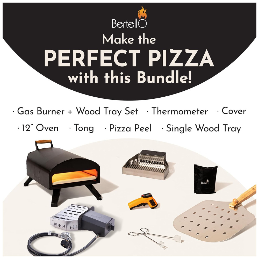 Forno Bertello, queimador a gás, casca de pizza, bandeja de madeira para queimador a gás, tampa e termômetro incluídos