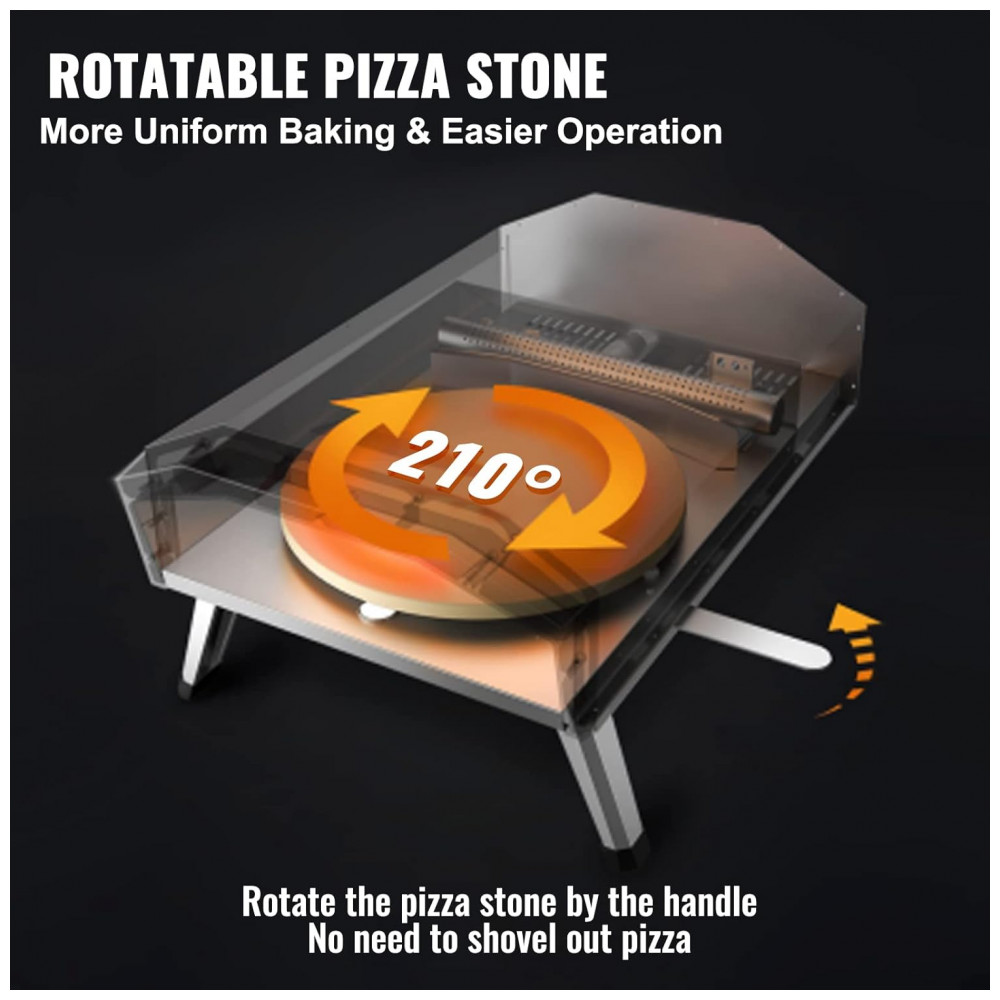 Gire para obter mais sabor Nosso forno de pizza portátil ao ar livre possui uma função de pedra de pizza rotativa para aquecimento uniforme e operação mais fácil. Basta girar a pedra para pizza em 210 usando a alça não há necessidade de ficar empurrando a pizza com uma pá para girá la com frequência, evitando problemas. Além disso, a pedra é engrossada para evitar quebras.