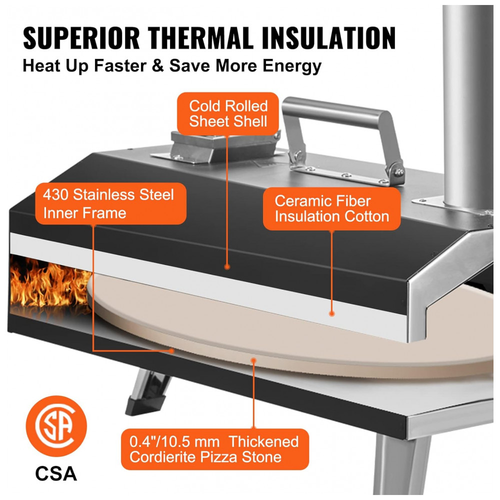 Retenha o calor para obter um sabor extra O forno de pizza portátil para uso externo é certificado pela CSA e construído com uma estrutura interna de aço inoxidável 430, algodão de isolamento de fibra cerâmica e revestimento de folha laminada a frio para maior qualidade. Essa estrutura de isolamento térmico de 3 camadas proporciona a melhor retenção de calor, permitindo que você desfrute da sua comida rapidamente.