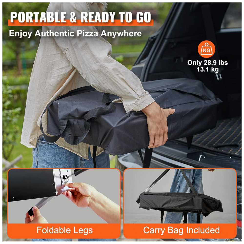 Forno portátil para uso externo Este forno de pizza tem um peso leve de 13,2 kg, facilitando o transporte para o quintal, acampamentos, praia ou qualquer local de encontro ao ar livre. Suas pernas dobráveis o tornam ainda mais compacto, e também fornecemos uma pá de pellets de madeira e uma bolsa de transporte para maior comodidade