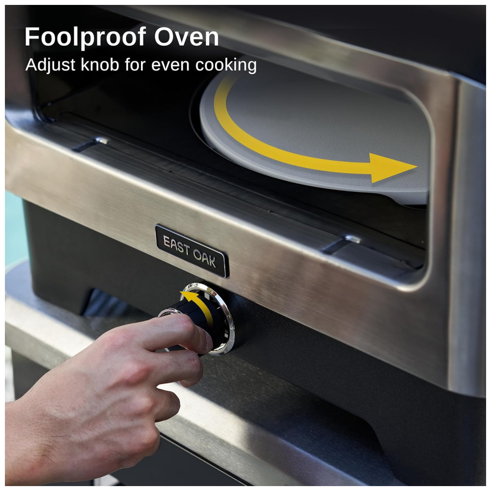 O inovador forno de pizza exterior EAST OAK destaca-se por sua característica exclusiva: um botão cuidadosamente projetado que permite a rotação de 360° da pedra de pizza, eliminando a necessidade de uma casca. Essa inovação garante uma distribuição uniforme do calor, resultando em pizzas perfeitamente assadas.