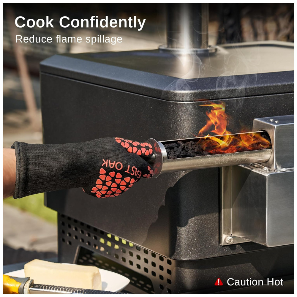 A segurança é uma prioridade, e por isso incluímos uma pá e uma câmara de combustível especialmente projetadas para evitar transbordamento de chamas. As instruções detalhadas no manual do usuário garantem um uso seguro, e recomendamos o uso de luvas anti-escalonamento (fornecidas, sem pellet de madeira).