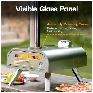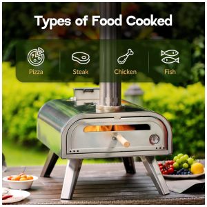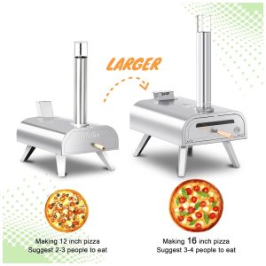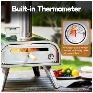 Este forno de pizza externo de 40 cm é perfeito para quem ama fazer pizzas em casa. Com apenas 15 minutos de pré aquecimento, ele pode chegar a 300 graus e cozinhar deliciosas pizzas assadas na pedra em até 6090 segundos, dependendo do tamanho da pizza. A dimensão total do forno de pizza é 63,50 cm x 45,72 cm x 91,44 cm e o peso é de 19,05 quilos. O forno vem com uma pedra de pizza de 40 cm e é fácil de usar e configurar. Ele possui um termômetro embutido na porta do forno, com uma janela de vidro para observar a chama. O termômetro frontal é mais conveniente para observar mudanças de temperatura, tornando o forno de pizza mais humanizado e melhorando seu desempenho. A câmara de combustão maior aumenta o número de pellets que podem ser colocados e adiciona um prato na câmara de combustão para ajustar a posição da entrada de ar, podendo ser fechada quando a chama é muito grande, fazendo com que a temperatura tenda a ser mais uniforme. Todo o forno de pizza é feito de material de aço inoxidável, com quatro pernas dobráveis que proporcionam estabilidade quando o forno de pizza é usado. Com grande área de cozimento e chaminé, há menos fumaça e chama mais uniforme, com design de queima eficiente, aumentando o tempo de uso.