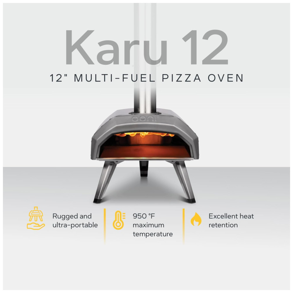 O forno de pizza Ooni Karu 12 polegadas ou 30 cm é equipado com uma bandeja de combustível personalizada que maximiza o fluxo de ar e fornece uma poderosa explosão de chama abrasadora, permitindo que ele mantenha temperaturas ultra altas. Você pode carregá lo com lenha ou carvão real sem se preocupar com excesso de cinzas para limpar. Com este forno, você pode assar uma pizza em apenas 60 segundos Ele pode ser acendido com lenha ou carvão direto da caixa, ou você pode usar o queimador de gás Ooni vendido separadamente para cozinhar com gás. O Karu 12 estará pronto para cozinhar em 15 minutos, atingindo uma enorme pizza assada na pedra autêntica de 510 ºC. Além disso, pesando apenas 11,97 quilos, é um forno de pizza externo ultra portátil, podendo ser movido facilmente. Dobre as pernas e retire a chaminé para desfrutar da liberdade de cozinhar pizzas incríveis na sua próxima aventura ao ar livre. O forno de pizza multicombustível Ooni Karu 12 foi projetado para oferecer uma ótima pizza, e é um dos fornos mais populares da Oonis. Além disso, ele é versátil e pode ser usado para cozinhar bife, peixe ou vegetais em uma de nossas panelas de ferro fundido.
