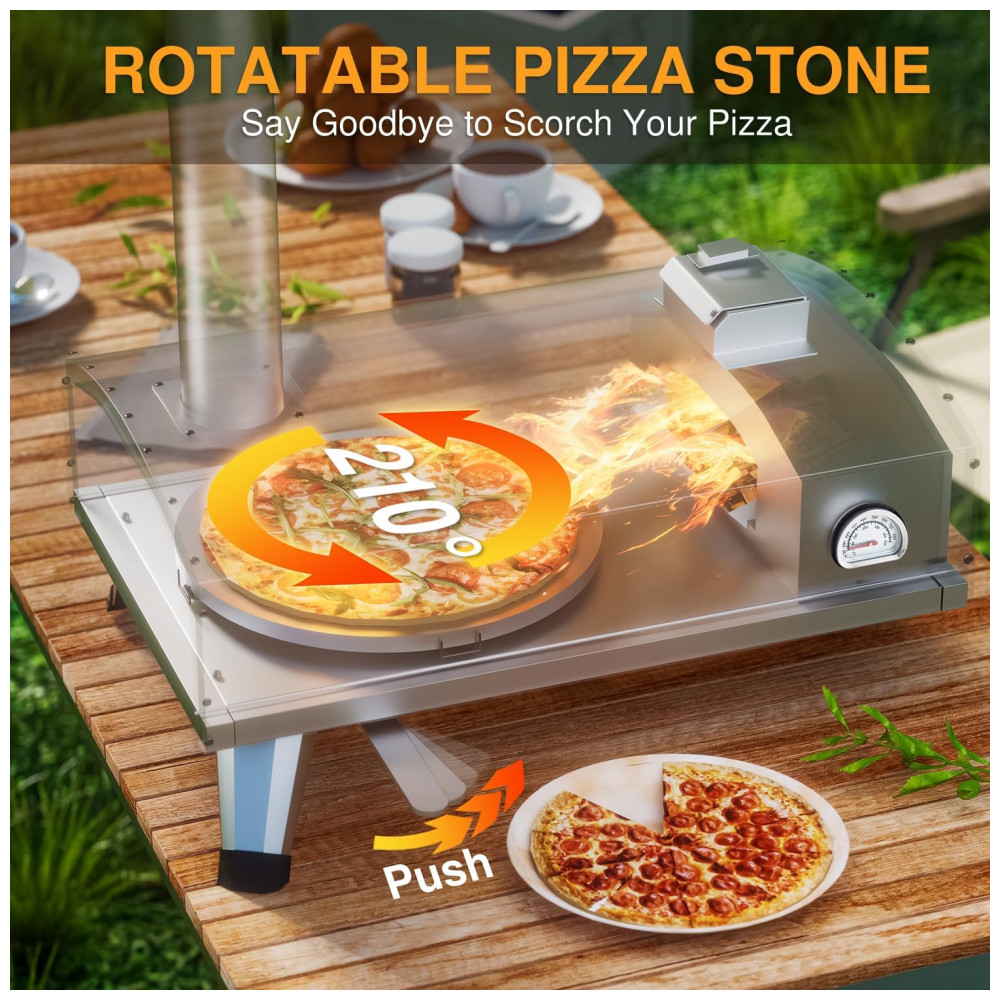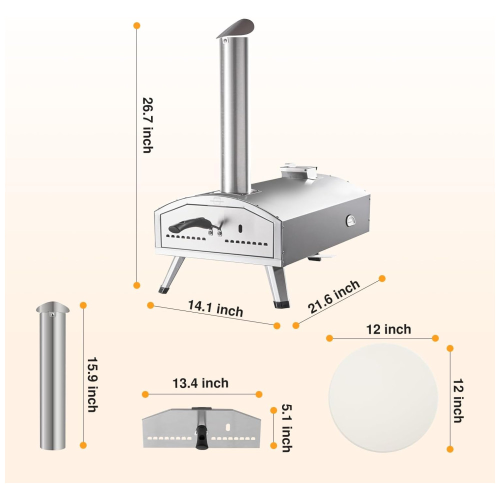 O forno é fácil de usar e pode ser montado rapidamente. Ele vem equipado com uma pedra giratória para pizza de 210 cm, que elimina o problema de girar a pizza durante o cozimento e permite que ela seja aquecida de maneira mais uniforme. As pernas suportam dobramento, e a chaminé e a tremonha podem ser facilmente desmontadas para fácil portabilidade e armazenamento, perfeitas para churrascos, festas, piqueniques ou acampamentos ao ar livre.
