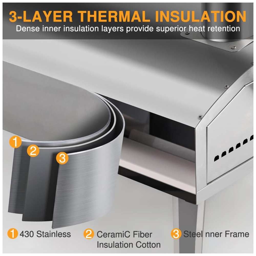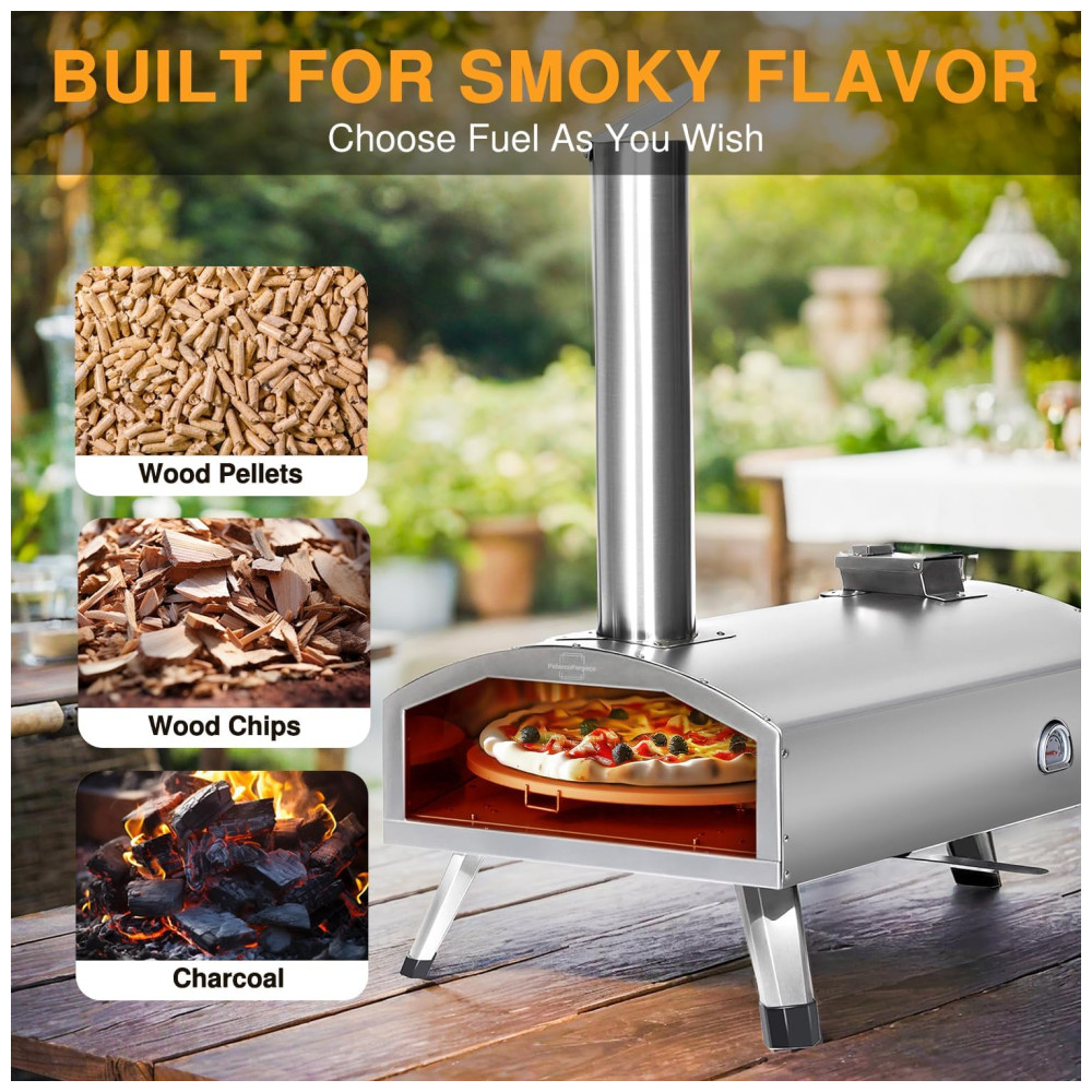 Este forno portátil para pizza é construído para oferecer um sabor autêntico de lenha. A bandeja de combustível especialmente projetada tem maior capacidade e elimina a necessidade de adicionar lenha várias vezes, ajudando você a obter facilmente a combustão completa. Você pode escolher carvão para uma temperatura consistente, pedaços de madeira dura para uma queima controlável e madeiras frutíferas para um sabor especial.