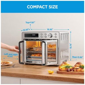 O forno combinado com torradeira e fritadeira de ar de porta francesa de grande capacidade de 25 litros acomoda perfeitamente uma pizza de 12 polegadas, até 6 fatias de torrada ou 14 suculentas asas de frango