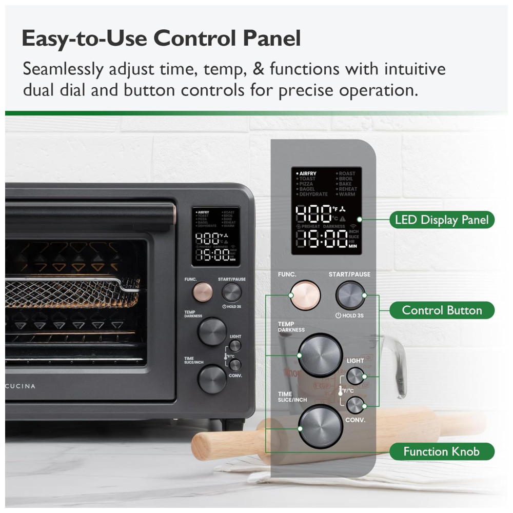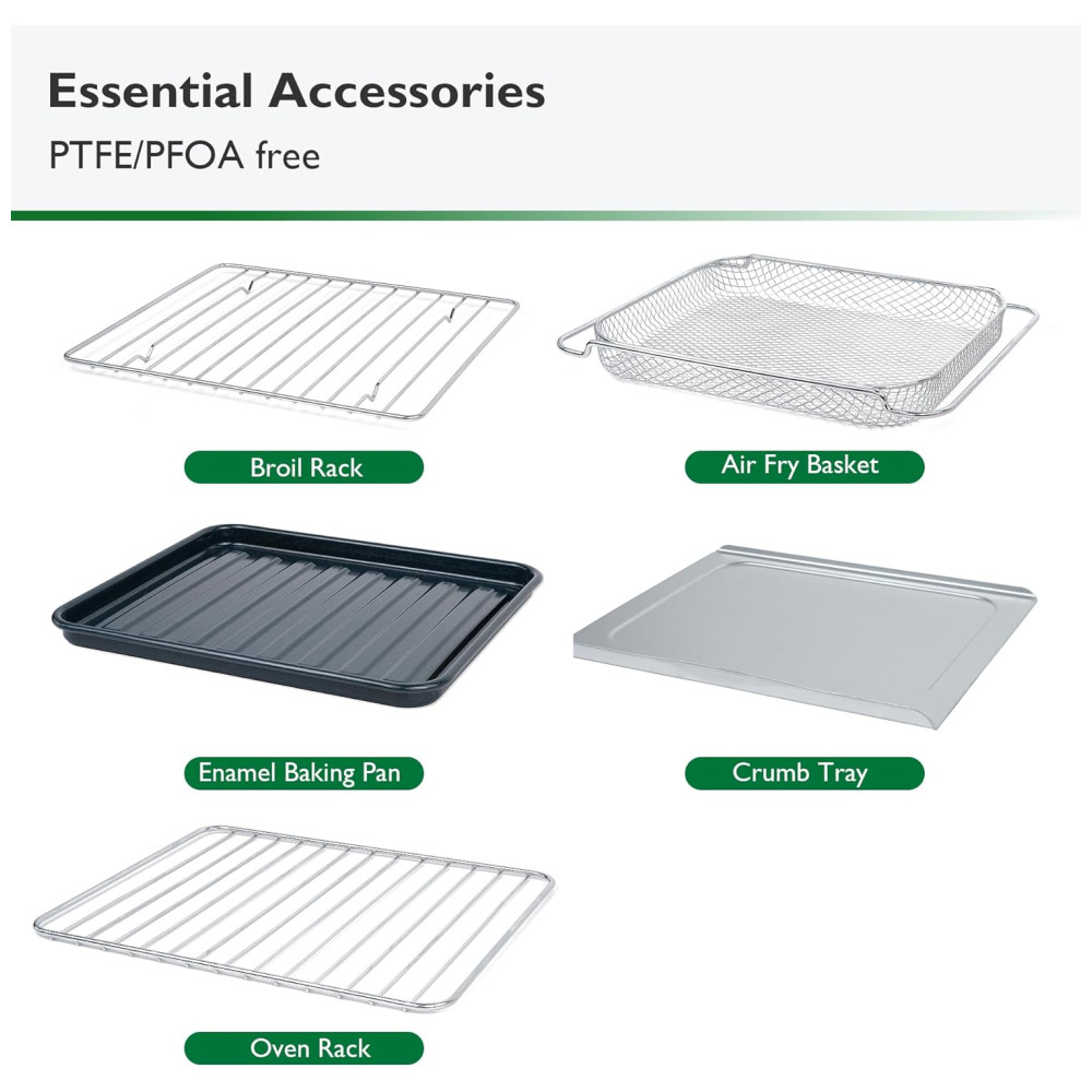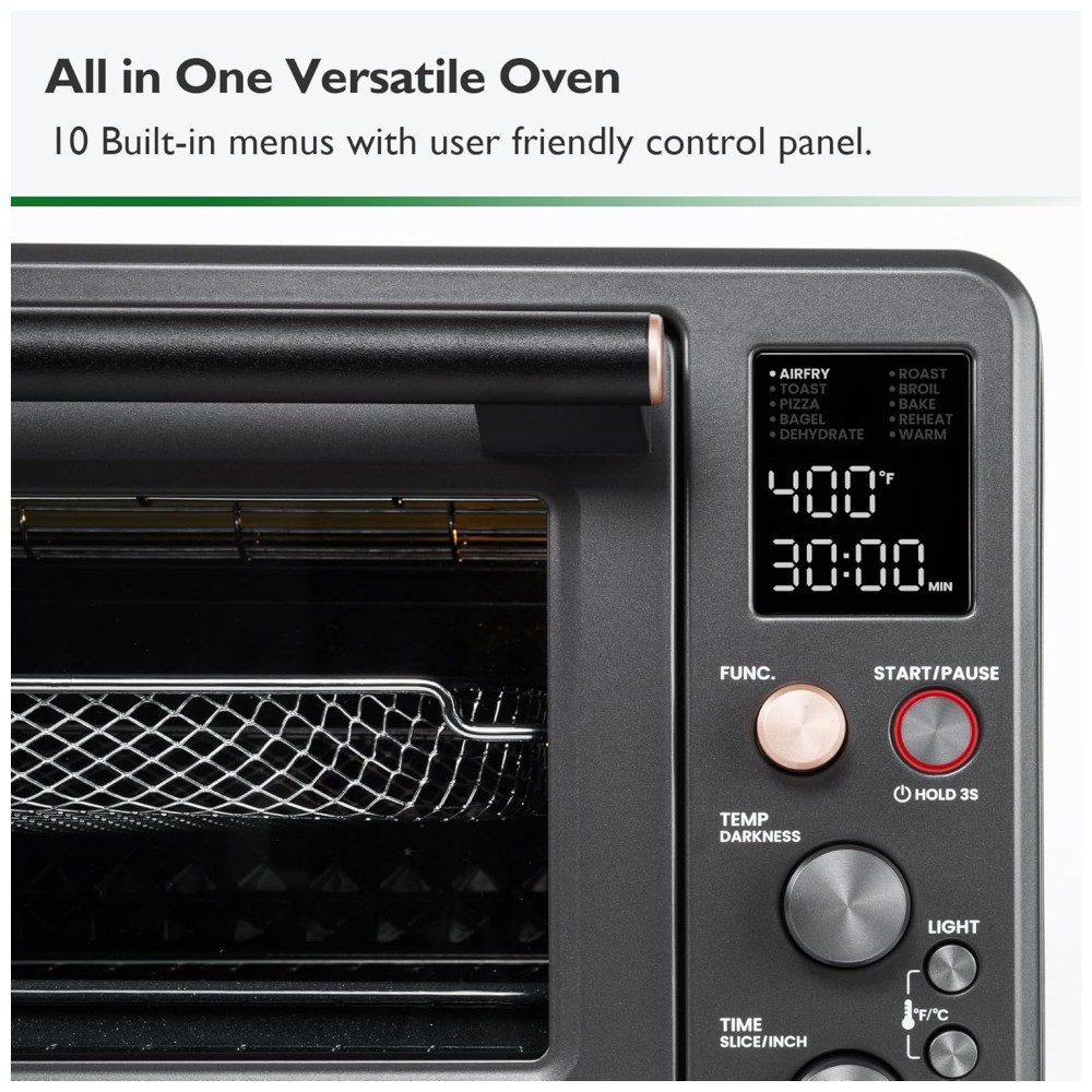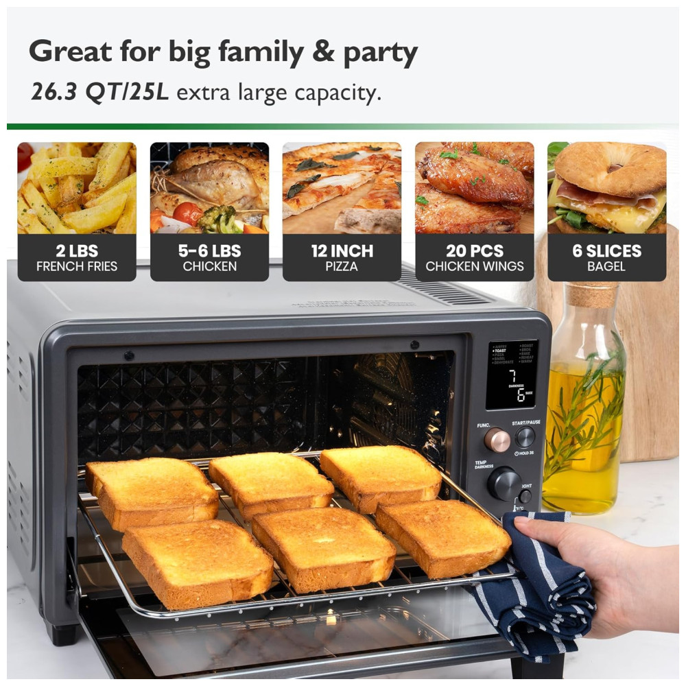 Forno de Grande Capacidade: Com seu generoso tamanho de 99,3 litros (equivalente a 26,3 quartos), este forno de bancada para fritadeira de ar pode facilmente acomodar um frango de 5 a 6 libras (cerca de 2,3 a 2,7 kg), torrar 6 fatias de pão ou assar uma pizza de 30 cm. Perfeito para suas diversas necessidades de cozimento.