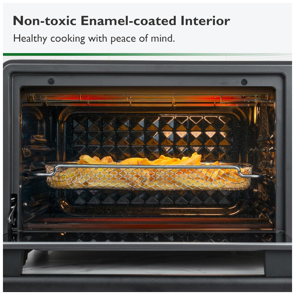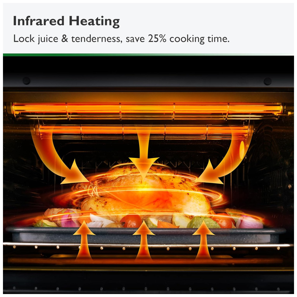 Elementos de Aquecimento Infravermelho Eficientes: Equipado com elementos de aquecimento infravermelho de alto desempenho e um ventilador de convecção, nosso forno e torradeira com fritadeira a ar garante um cozimento rápido, uniforme e eficiente todas as vezes.