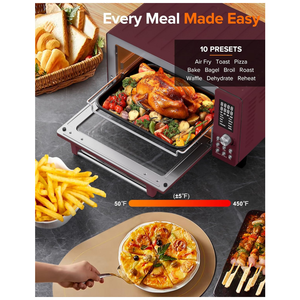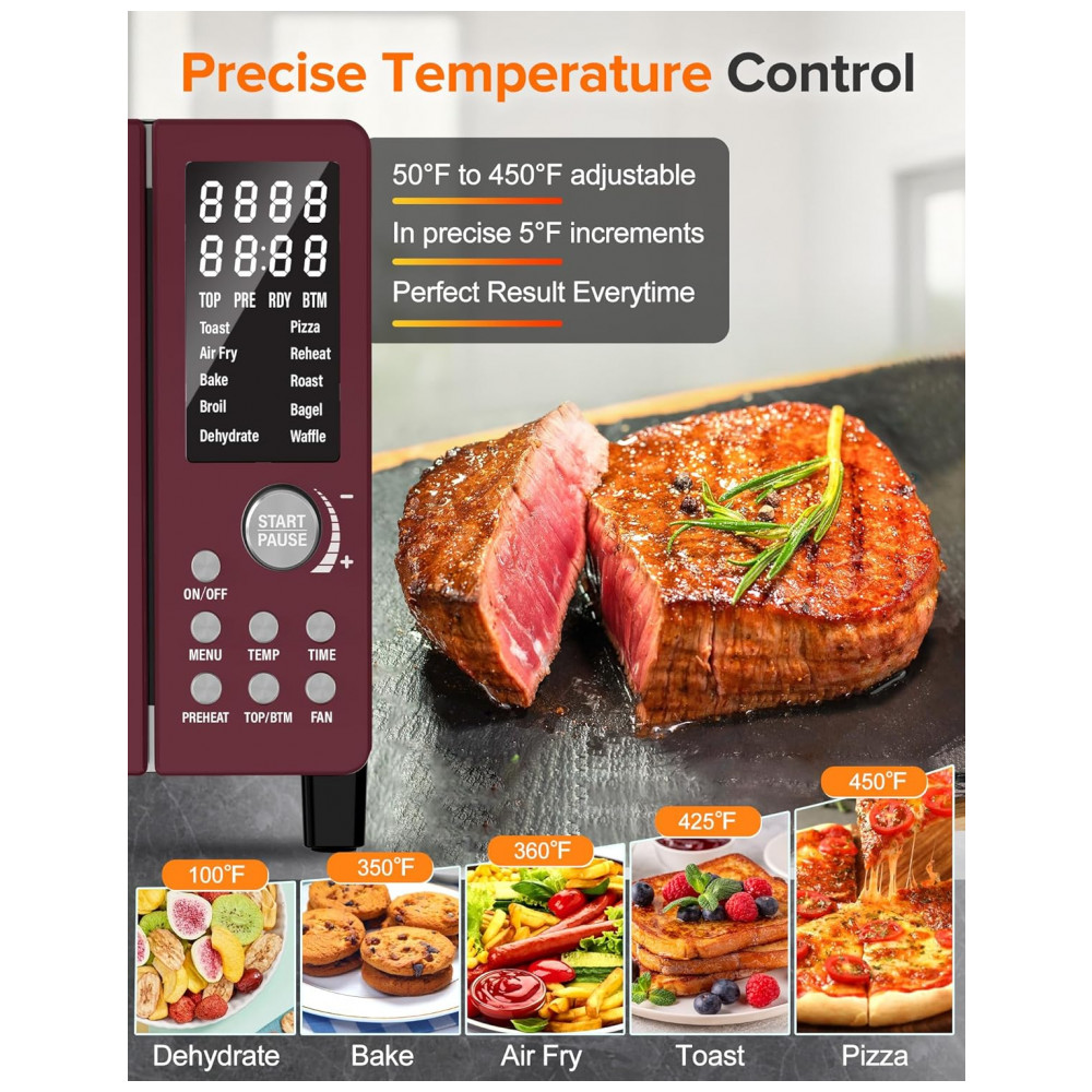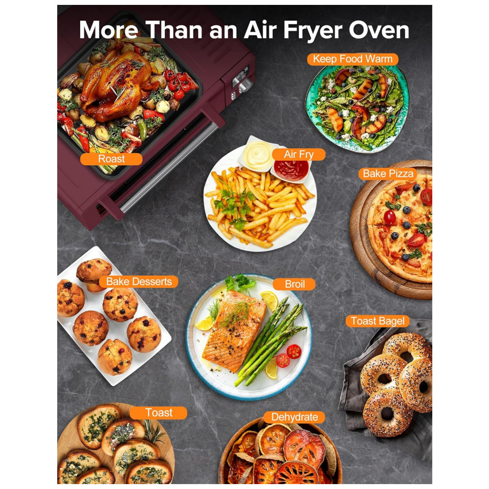 Este forno elétrico premium de 1800 watts e Air Fryer oferece 12 funções, incluindo: Air Fry, Air Roast, Grill, Assar, Tostar, Bagel, Desidratar, Reaquecer, Congelar, Waffle, Pizza e Manter Aquecido. Tudo isso em um único aparelho potente de 1800 watts.