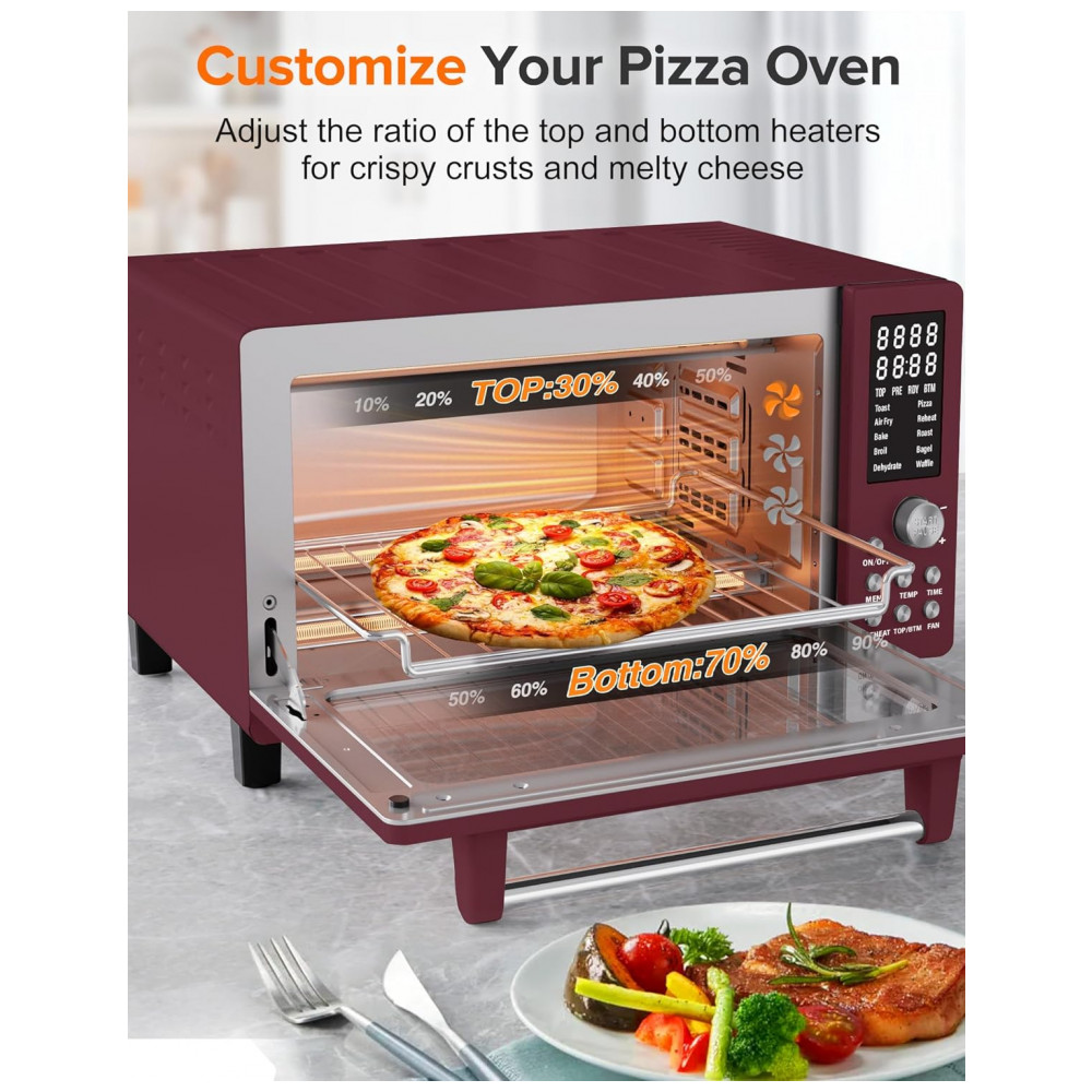 Ajuste a intensidade dos aquecedores superior e inferior (de 0 a 100%) e a velocidade do ventilador de convecção, criando diferentes zonas de aquecimento para resultados perfeitos. Para assar uma pizza de crosta crocante e queijo derretido, basta configurar os aquecedores inferiores em 70% e os superiores em 30%.