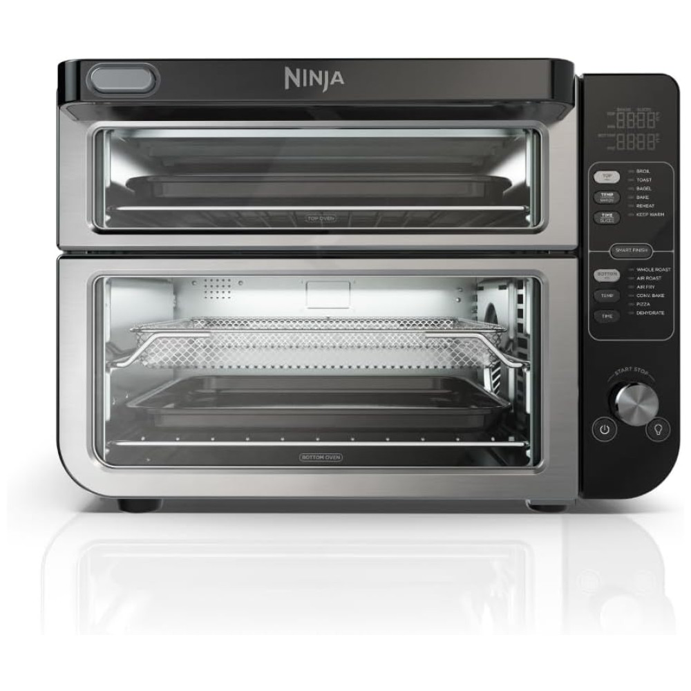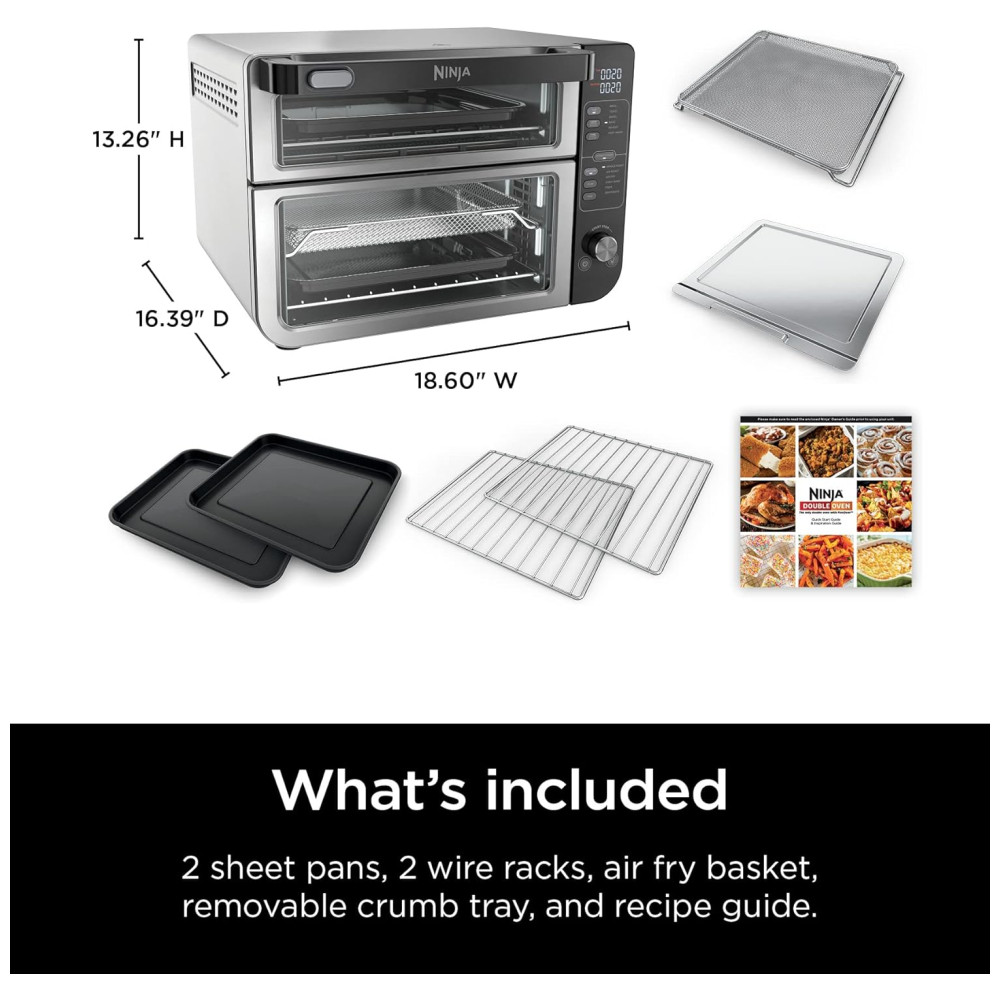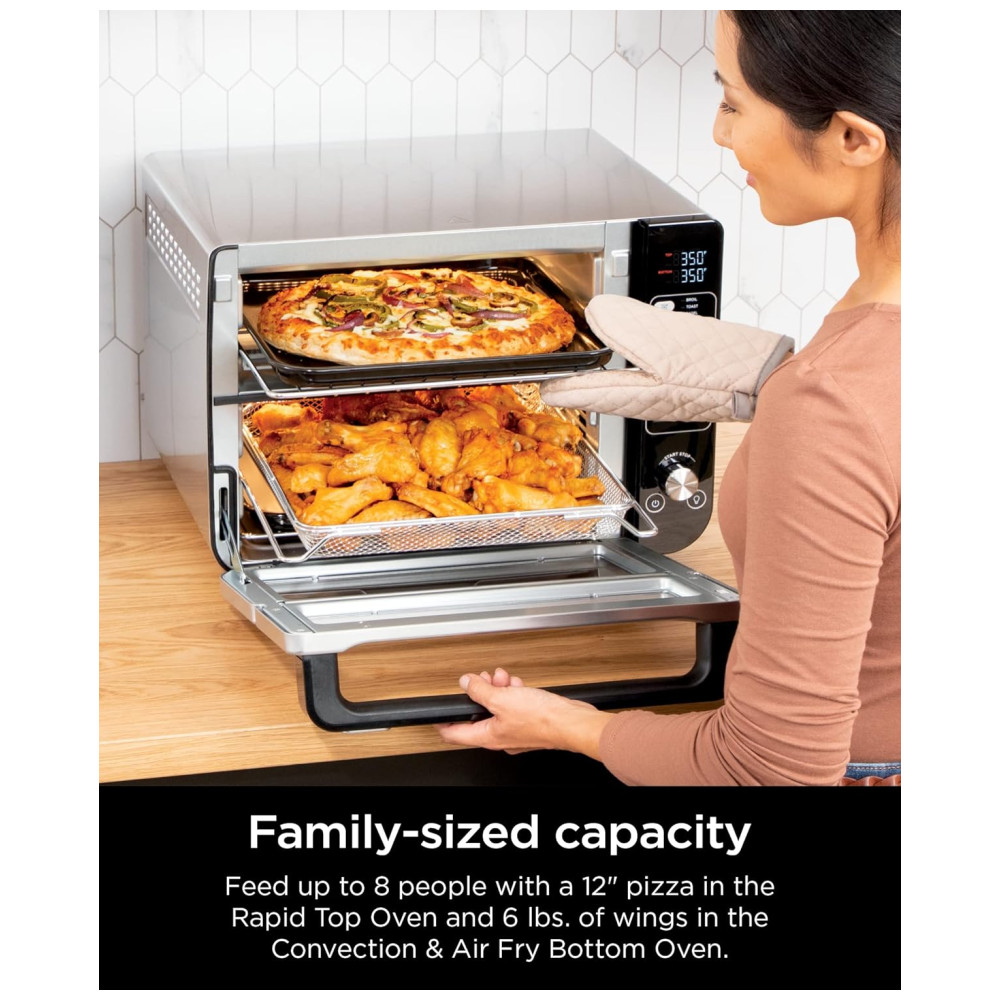 O forno duplo da Ninja acomoda até 2,7 kg de asas de frango e uma pizza de 30 cm ao mesmo tempo, servindo até 8 pessoas.