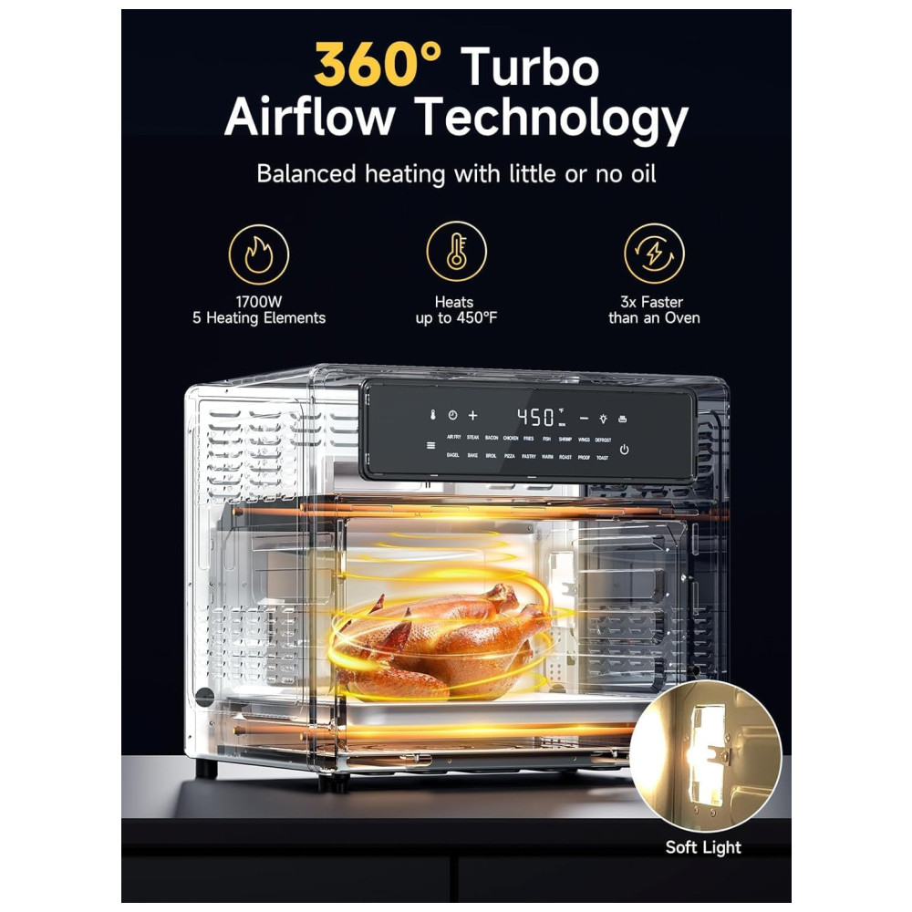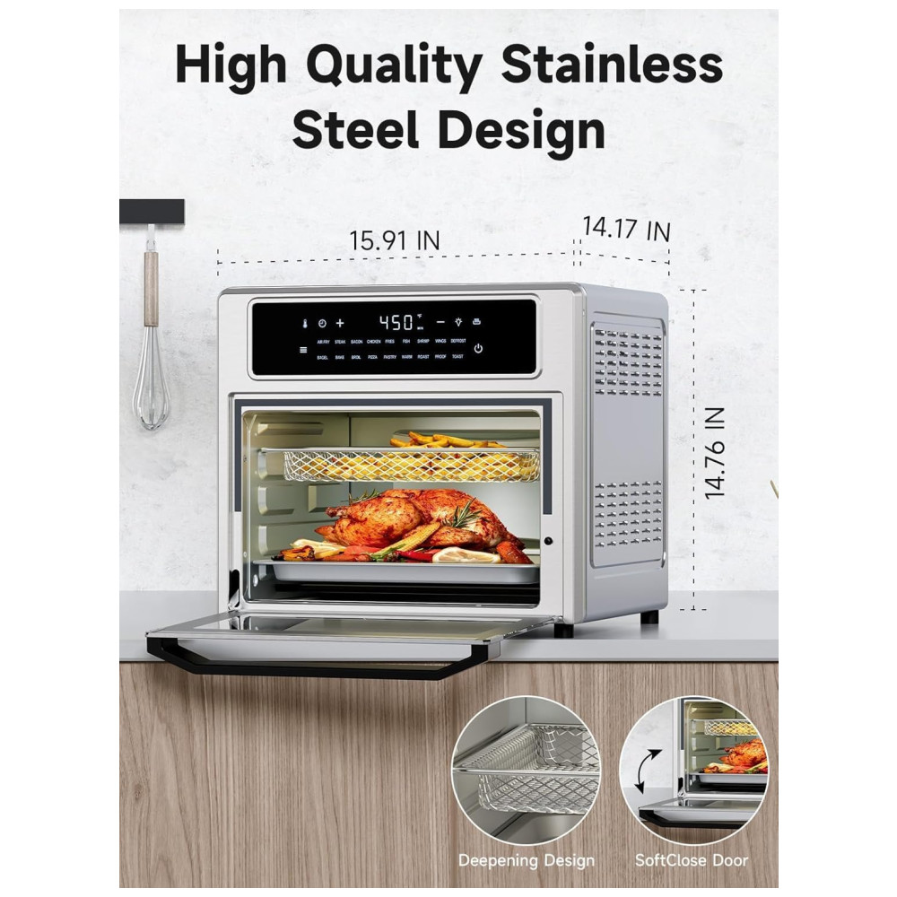 Design Elegante e Sofisticado: A construção premium em aço inoxidável e a luz suave do forno proporcionam um visual sofisticado, elevando a estética de sua cozinha. O design elegante não só adiciona um toque de classe, mas também torna a Air Fryer um excelente presente para quem aprecia funcionalidade com estilo.