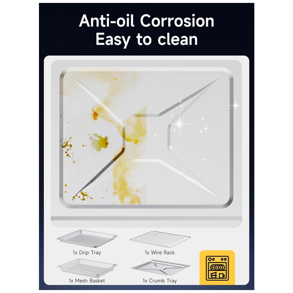 Limpeza Sem Esforço e Economia de Tempo: A Air Fryer foi projetada para ser fácil de limpar. Feita com aço inoxidável e materiais antiaderentes, todos os acessórios, como a cesta de fritura, grelha, assadeira e bandeja de migalhas, podem ser lavados na máquina de lavar louça. Isso economiza tempo valioso e torna a limpeza uma tarefa simples e sem complicação.
