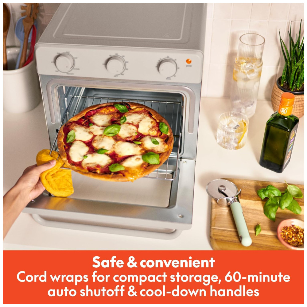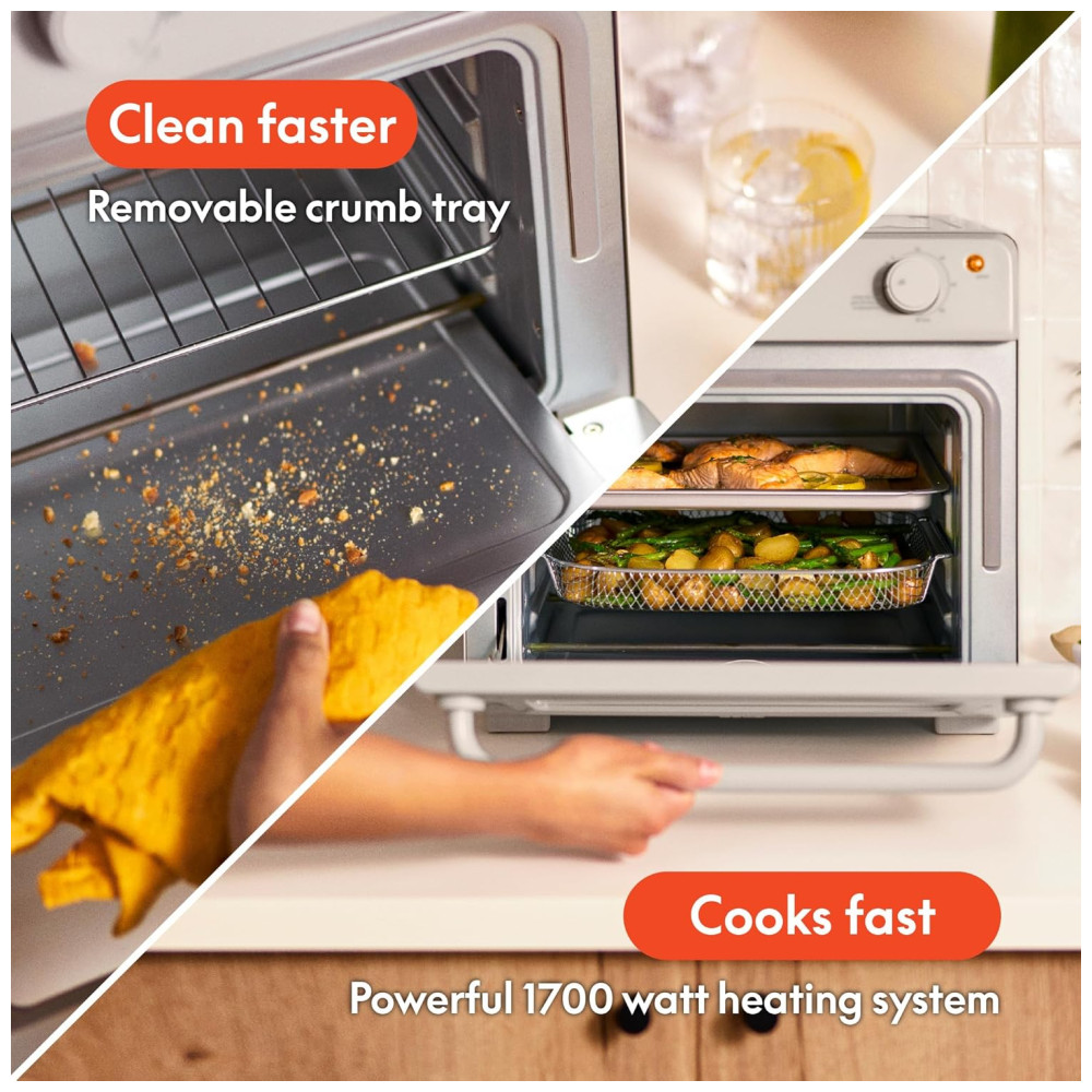 Seguro e Fácil de Limpar: Este forno tostador é projetado com a segurança e a praticidade em mente. A porta de vidro temperado e a alça de toque frio garantem que você possa verificar seus alimentos com segurança, sem risco de queimaduras. Após o preparo, a limpeza é simples e rápida, graças a componentes como a bandeja de migalhas removível e as peças laváveis na máquina de lavar louça. Assim, você pode focar no prazer de cozinhar, sem se preocupar com a limpeza após o uso.