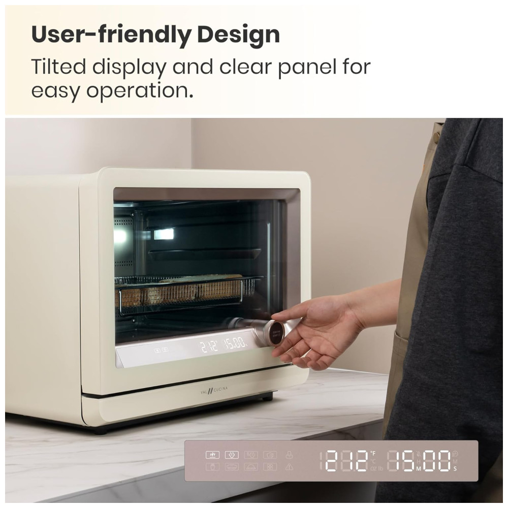 Operação Sem Esforço: Com design intuitivo, o forno VAL CUCINA apresenta o painel de exibição EasyOnEye*, de alto contraste e inclinação de 55 graus, e um único botão EasyNavi* para visualização, configuração e confirmação de operações. Um alarme de alto volume alerta para cada passo do processo, garantindo que você nunca perca um detalhe. A operação é descomplicada e sem estresse.