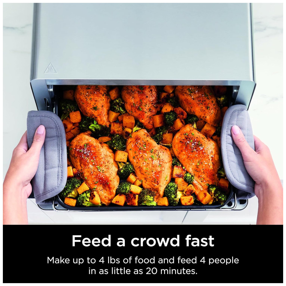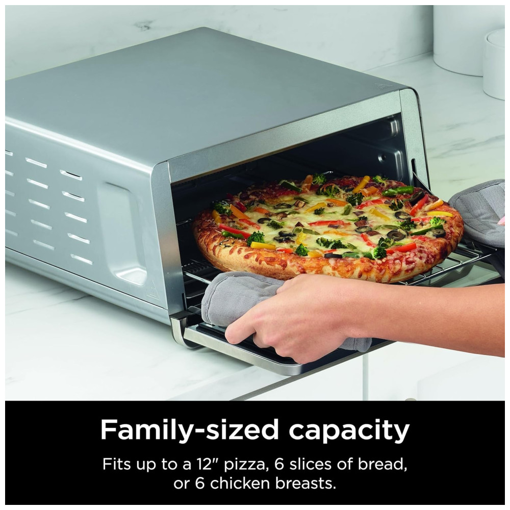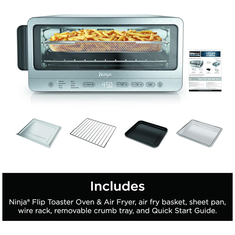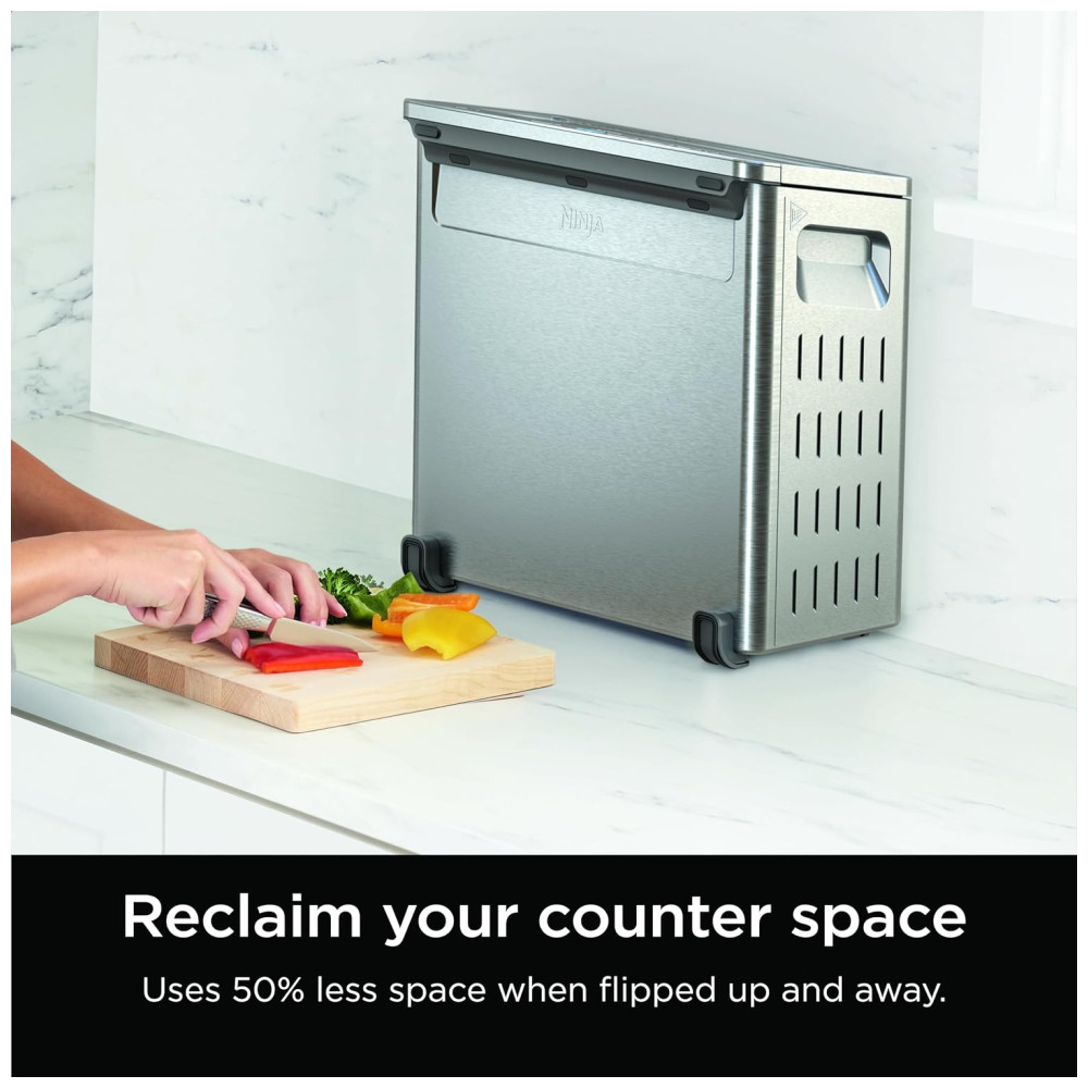 O Ninja Flip Toaster Oven Air Fryer é um eletrodoméstico multifuncional de bancada que reúne as funções de forno de convecção, fritadeira sem óleo (Air Fryer) e torradeira. Seu design inovador permite que ele seja virado para cima e guardado contra a parede quando não estiver em uso, economizando 50% de espaço no balcão da cozinha.