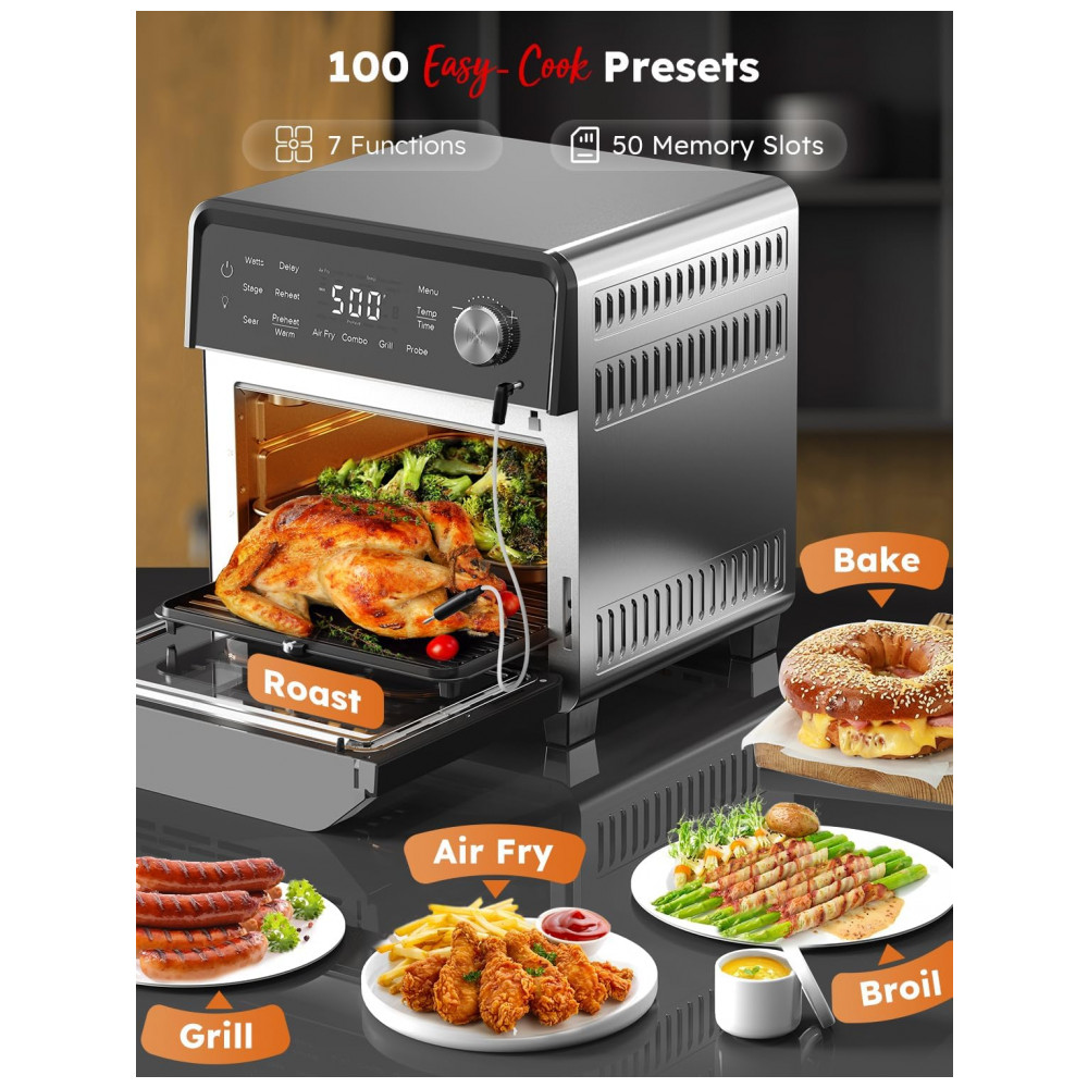 Os acessórios incluem grelha plug-in antiaderente, assadeira e bandeja coletora, cesto de air fryer, grade de arame e sonda de temperatura, possibilitando assar, grelhar, fritar com ar quente e aquecer alimentos em diferentes configurações. Os componentes removíveis são projetados para limpeza facilitada, com superfícies antiaderentes e compatibilidade com lava-louças conforme instruções do fabricante. O corpo em aço inoxidável de grau alimentar aumenta a durabilidade e resistência à corrosão, reduzindo odores típicos de plásticos em altas temperaturas.